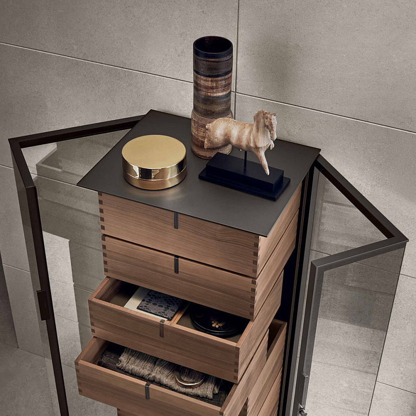 Внутреннее пространство включает выдвижные ящики из орехового дерева, выполненные с точной столярной обработкой. Ящики как будто «подвешены» внутри стеклянного корпуса на скрытой структуре, создавая эффект лёгкости и подчёркивая архитектурную чистоту конструкции.