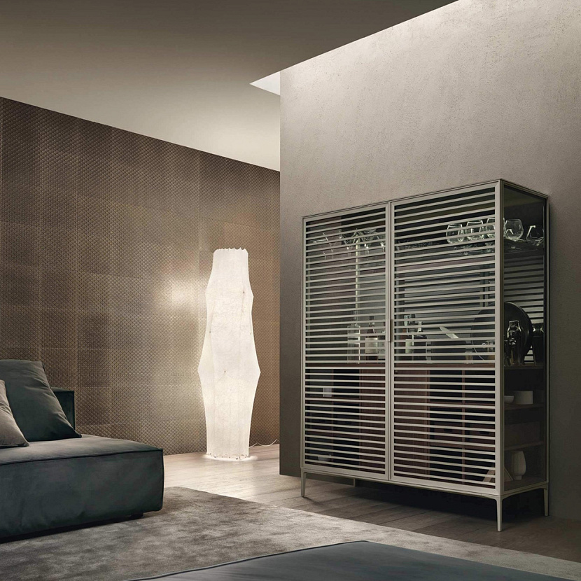 Конструкция построена на алюминиевом каркасе со стеклянными панелями и дверями, благодаря чему мебель сохраняет лёгкость и прозрачность архитектурной композиции. Столешницы, ручки и подносы могут выполняться с отделкой из экокожи, а интегрированная светодиодная подсветка подчёркивает материалы и делает содержимое шкафа частью интерьерной композиции.
