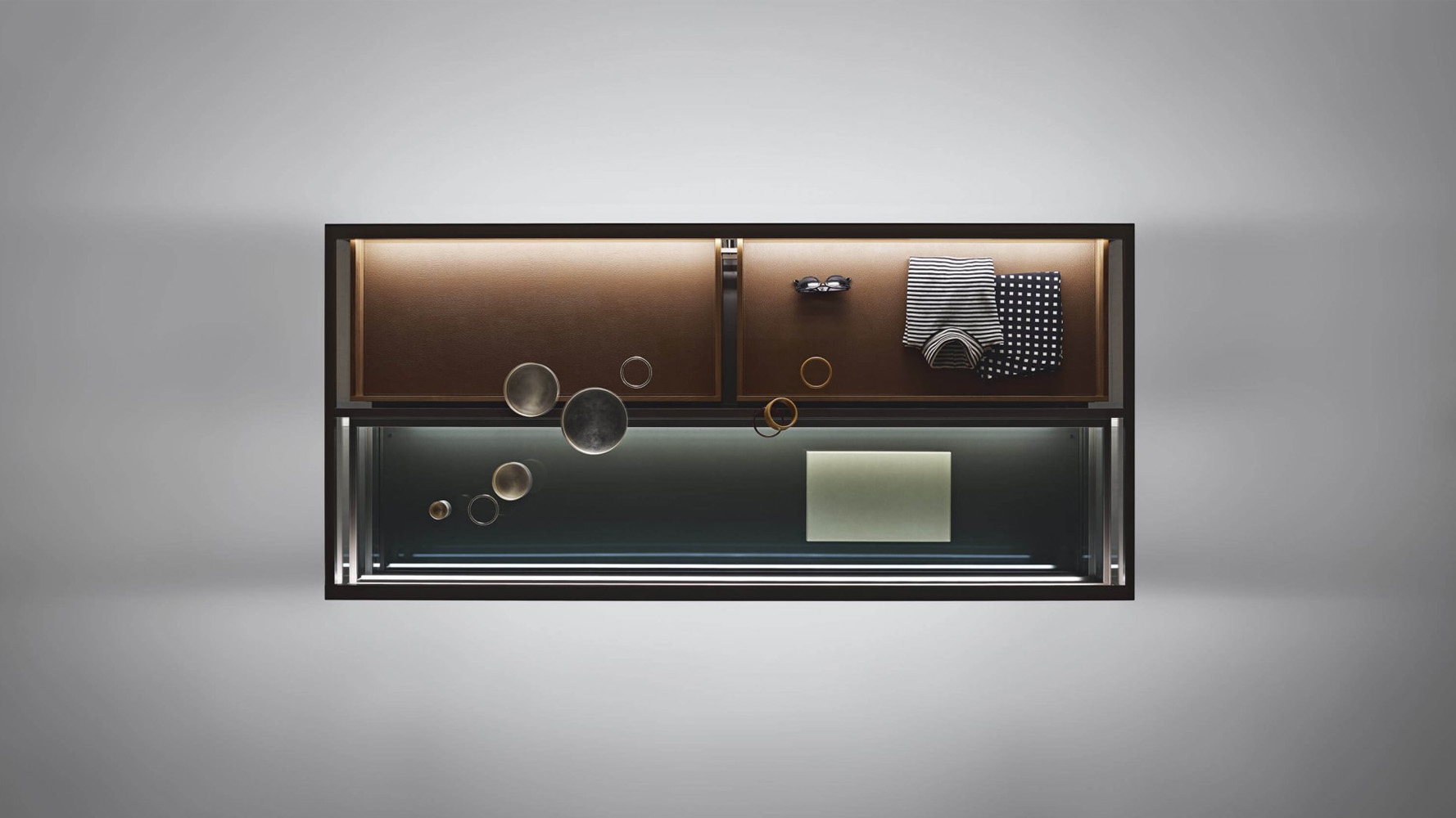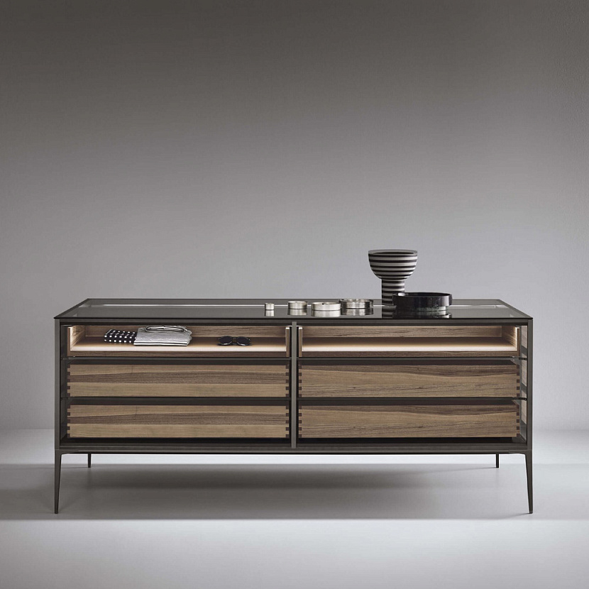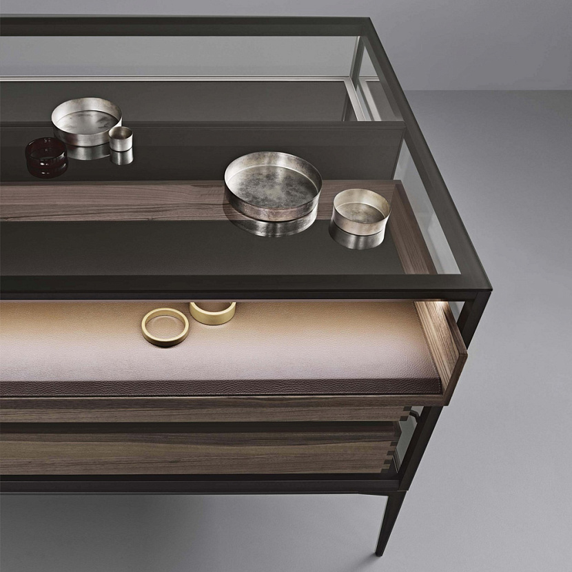 Внутреннее пространство может включать выдвижные ящики, стеклянные полки и аксессуары хранения. Отделка ящиков выполняется из орехового дерева, а дно может быть покрыто экокожей. Внутренняя задняя панель из серого зеркального стекла и встроенная LED-подсветка усиливают глубину композиции и подчёркивают размещённые внутри предметы.