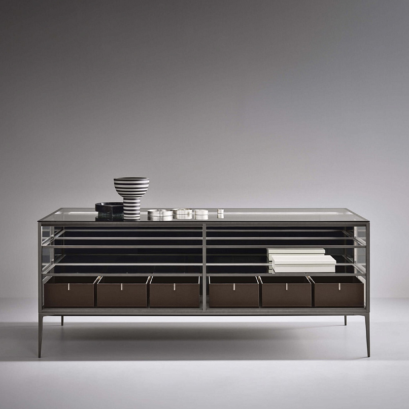 Alambra Isola интегрируется в интерьеры гостиной, гардеробной или бутик-пространств, где требуется островная витрина для хранения и демонстрации предметов.