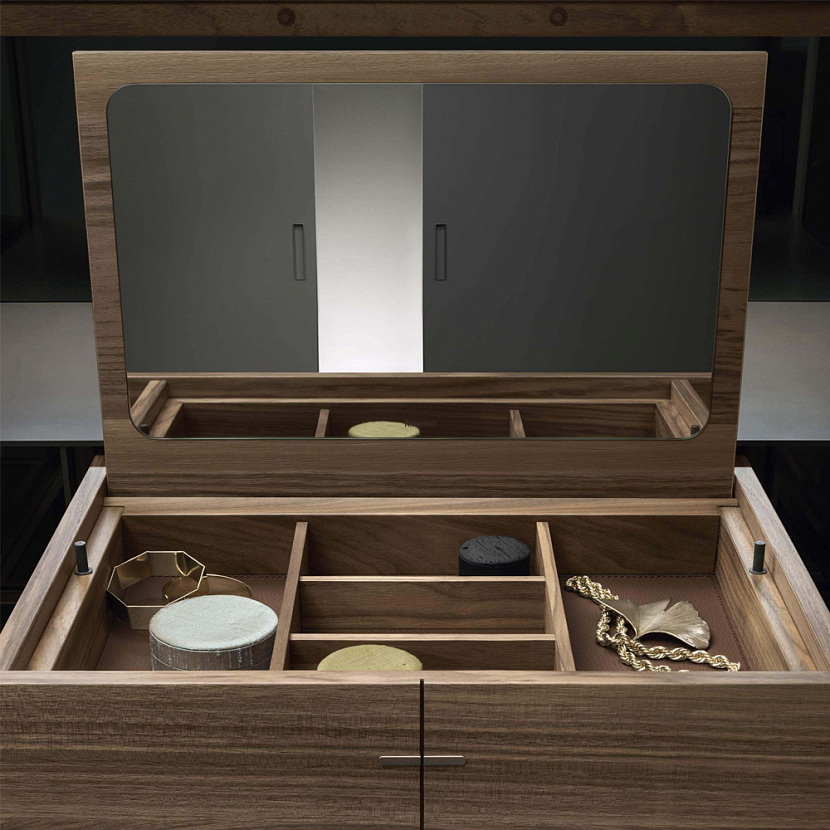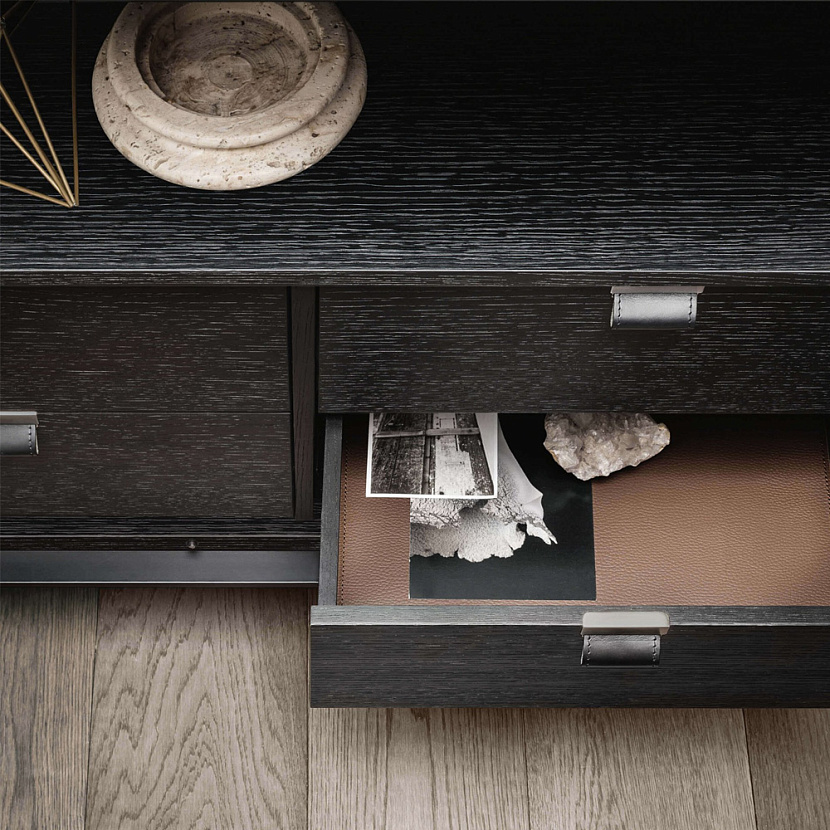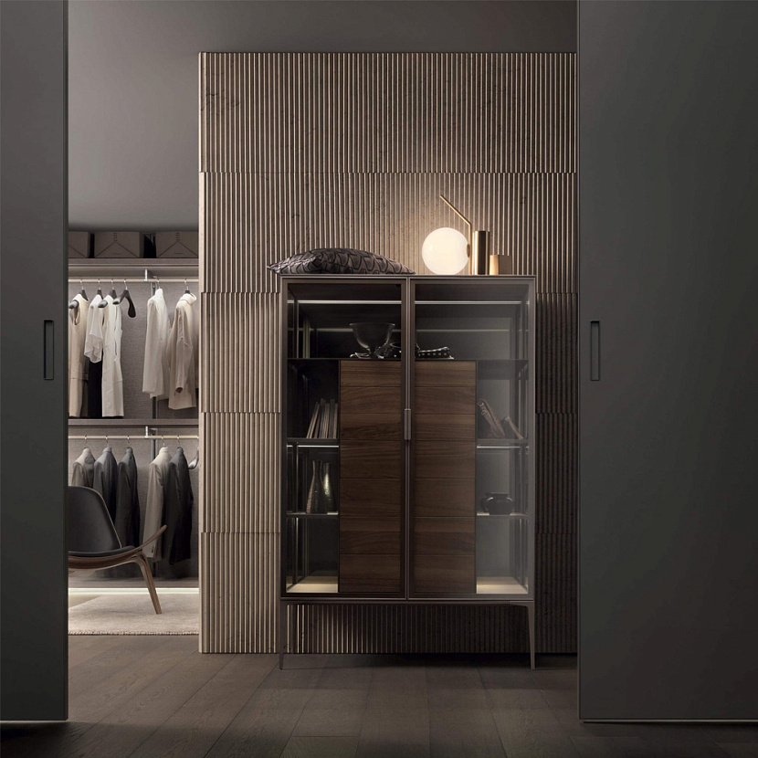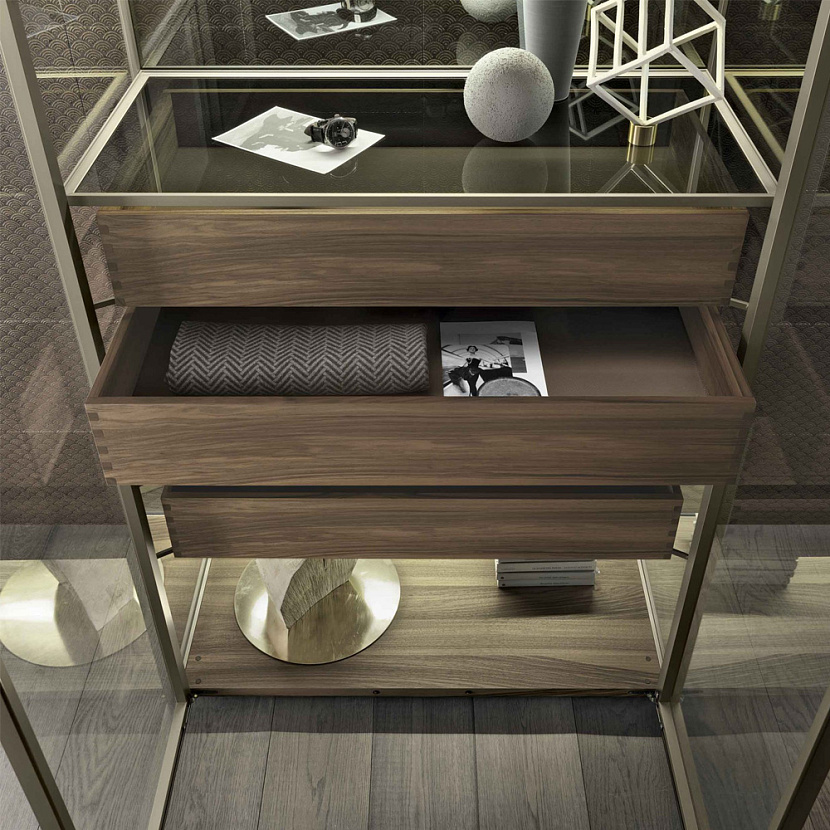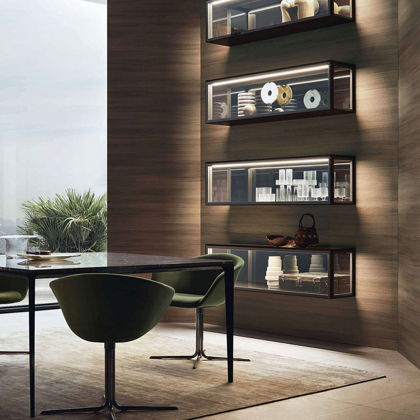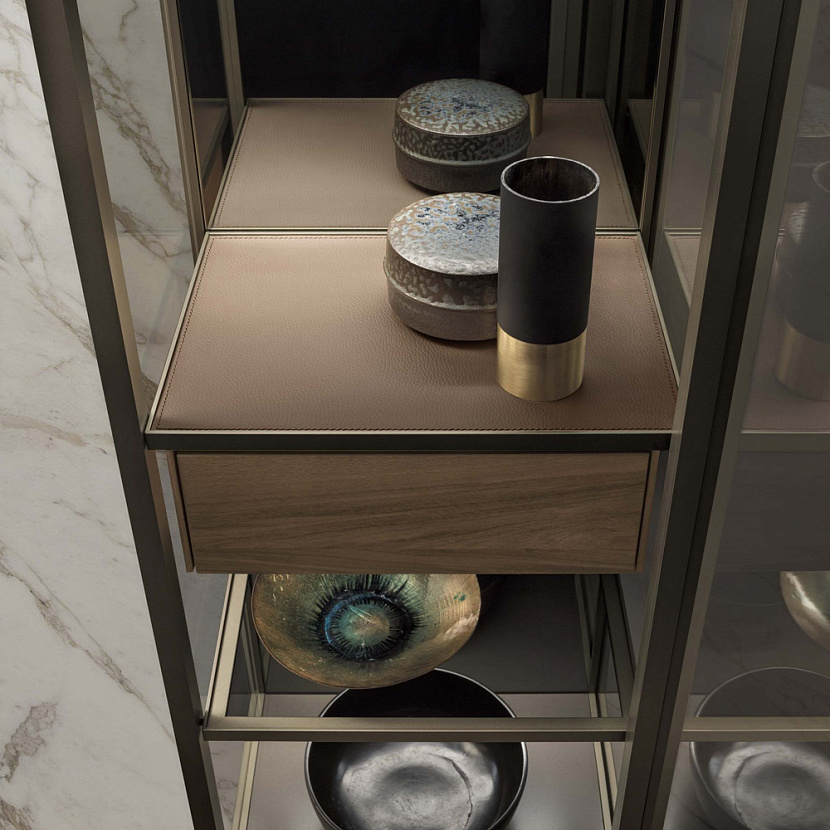 Внутреннее пространство может оснащаться стеклянными полками, выдвижными ящиками и различными аксессуарами хранения. Полки оснащаются интегрированной светодиодной подсветкой, благодаря чему предметы внутри витрины становятся частью интерьерной композиции. Система доступна в различных размерах и конфигурациях, включая версии буфета, витрины и барного шкафа.