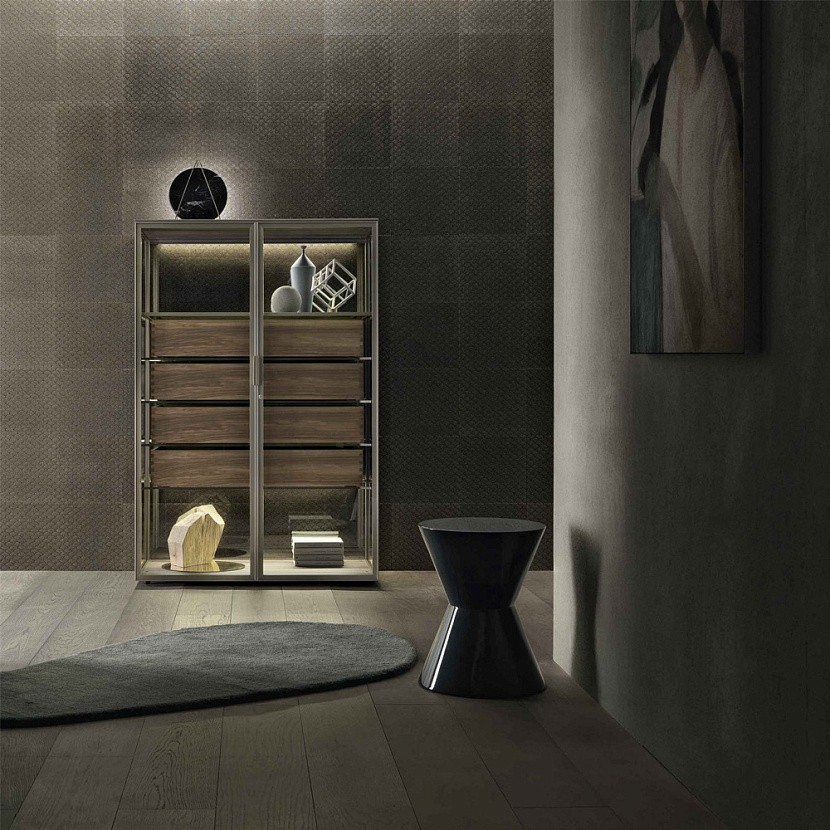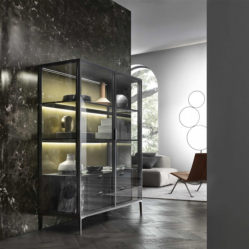 Система представляет собой современную интерпретацию классических предметов хранения — витрин, буфетов и шкафов. Конструкция построена на алюминиевом каркасе с дверями и боковыми панелями из стекла, что формирует прозрачную архитектурную структуру и подчёркивает содержимое мебели.