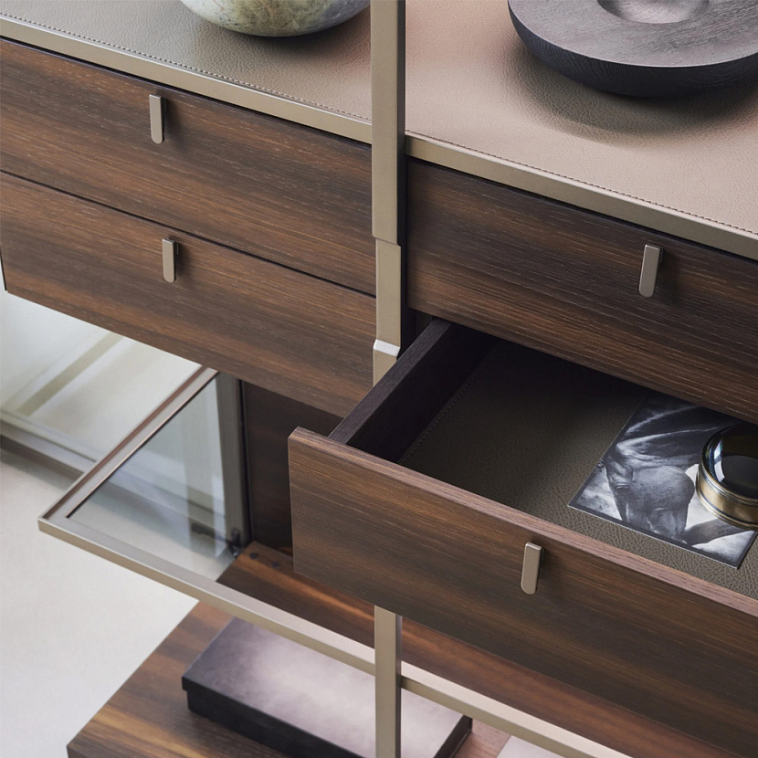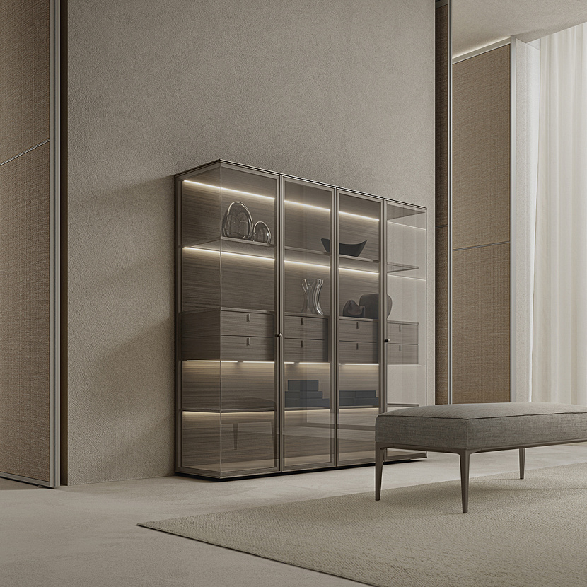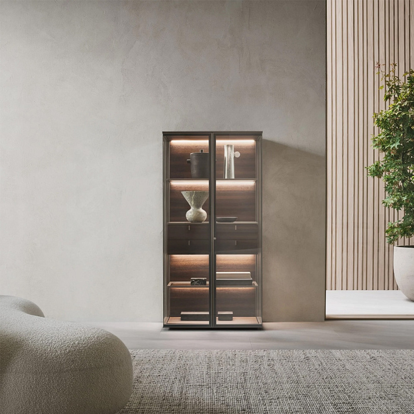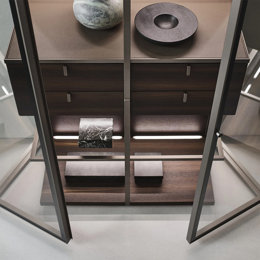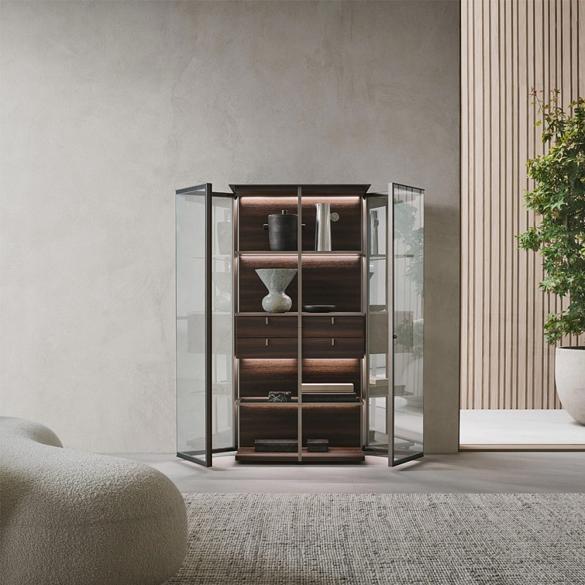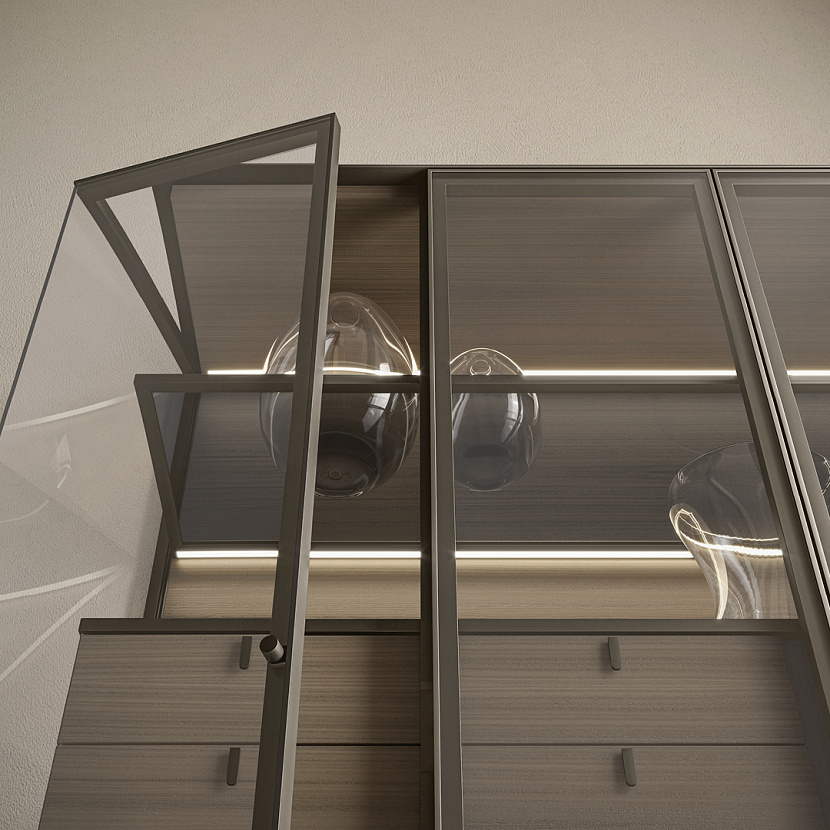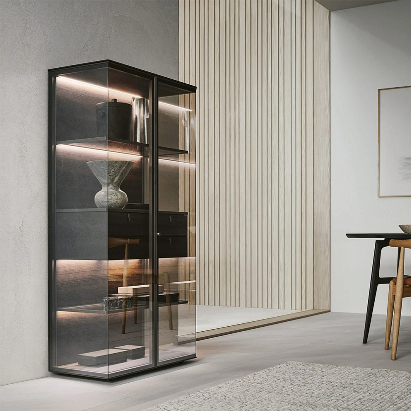 Тонкая алюминиевая структура и стеклянные панели формируют строгие пропорции и подчёркивают архитектурную чистоту композиции. Витрина предназначена для хранения и экспонирования предметов — декоративных объектов, посуды или коллекционных вещей — превращая содержимое в часть интерьерной композиции.