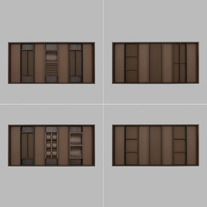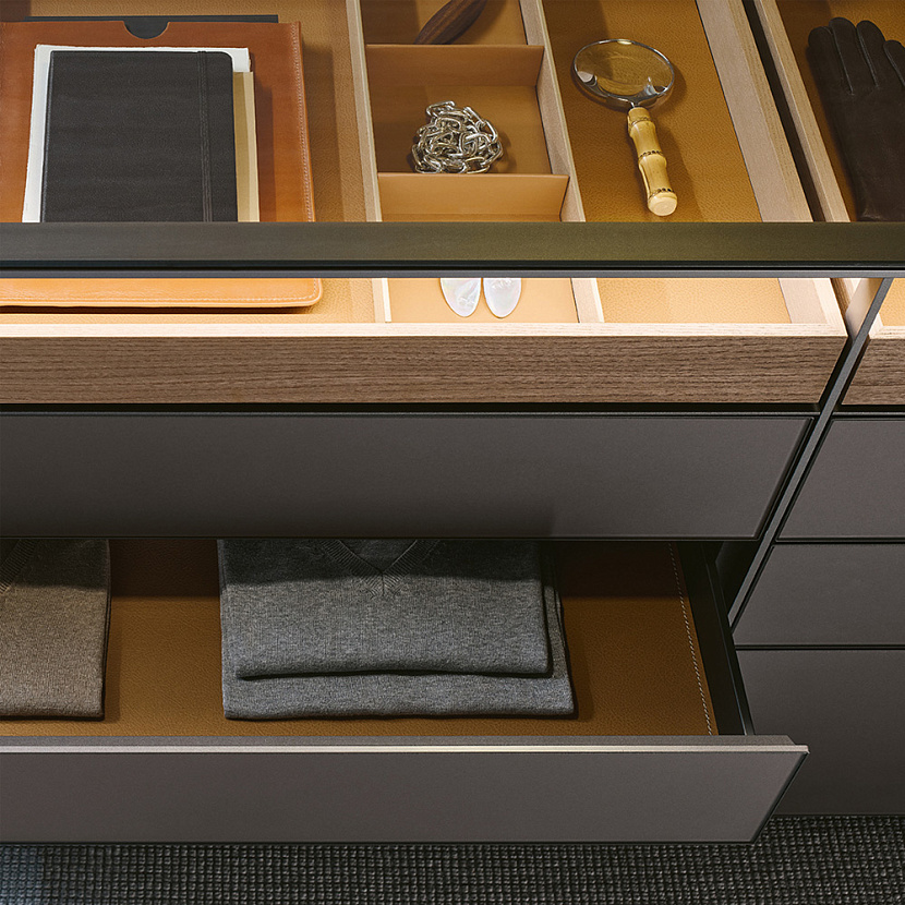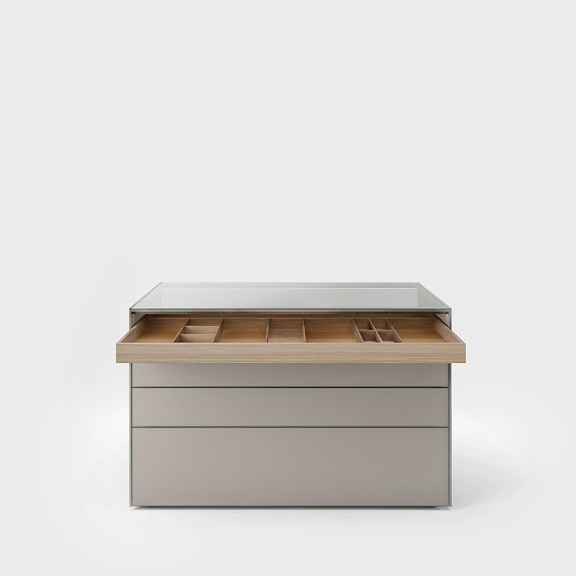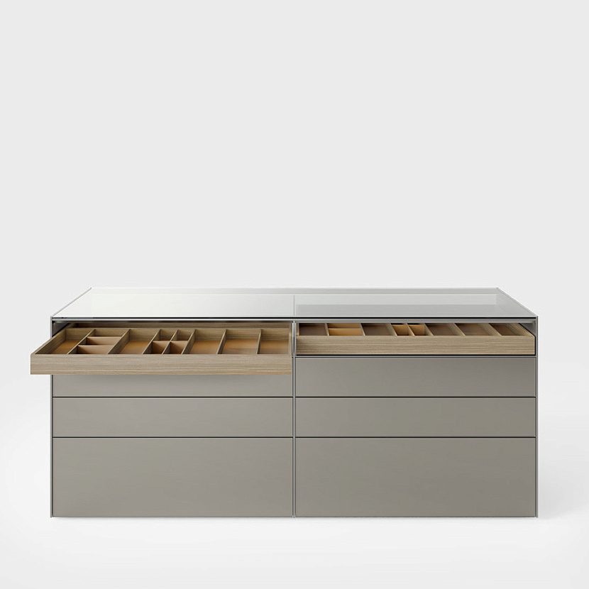 Внутренние лотки выполняются из древесины вяза или термообработанного дуба и могут оснащаться органайзерами с разделителями для хранения украшений, ремней, галстуков и других аксессуаров. Верхняя поверхность из стекла опирается на тонкие боковые панели, а алюминиевые профили под столешницей скрывают рассеянную LED-подсветку, освещающую выдвижные модули.