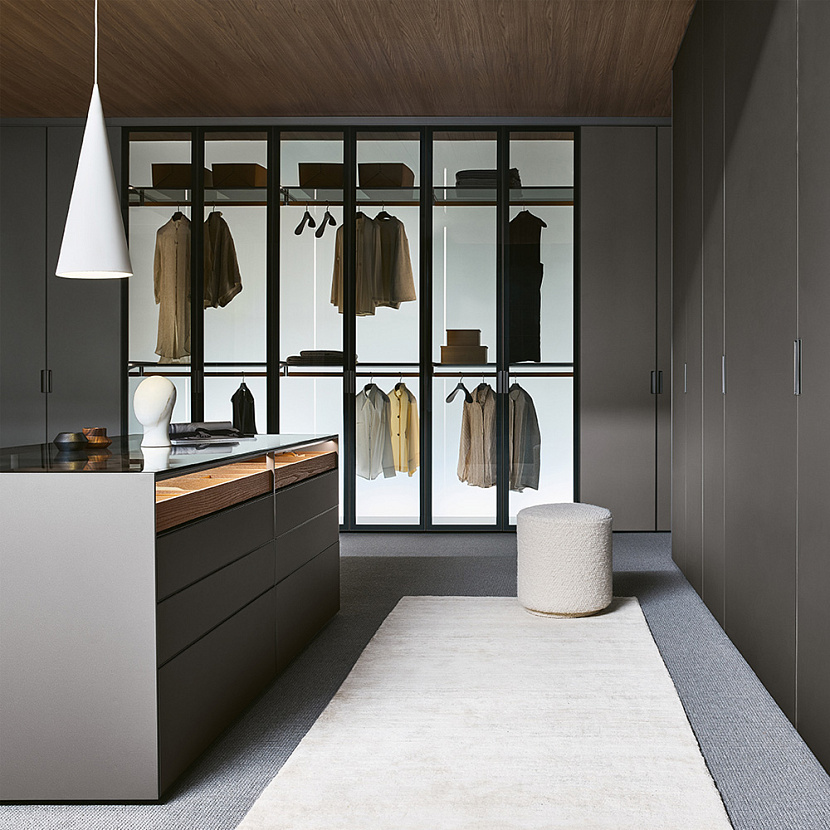 Altair интегрируется в интерьеры гардеробных и мастер-спален, где требуется центральный элемент хранения для аксессуаров, одежды и предметов гардероба.