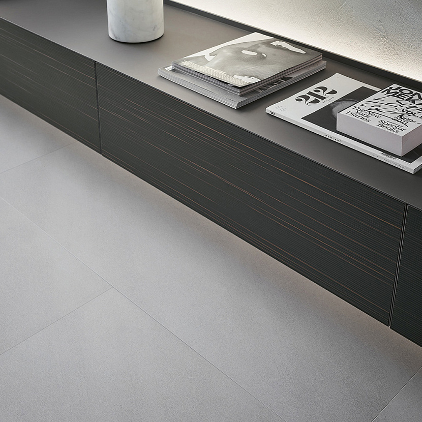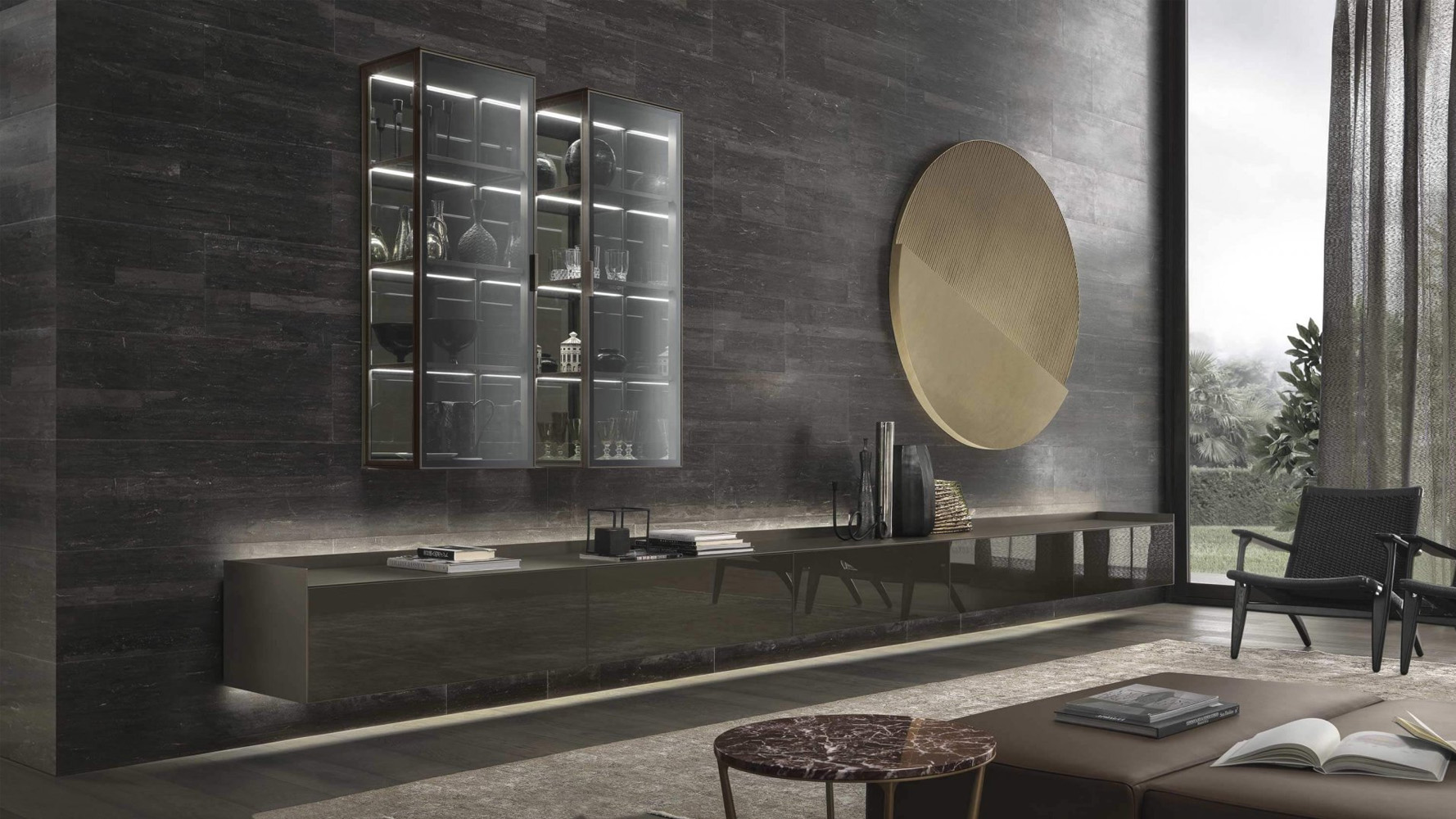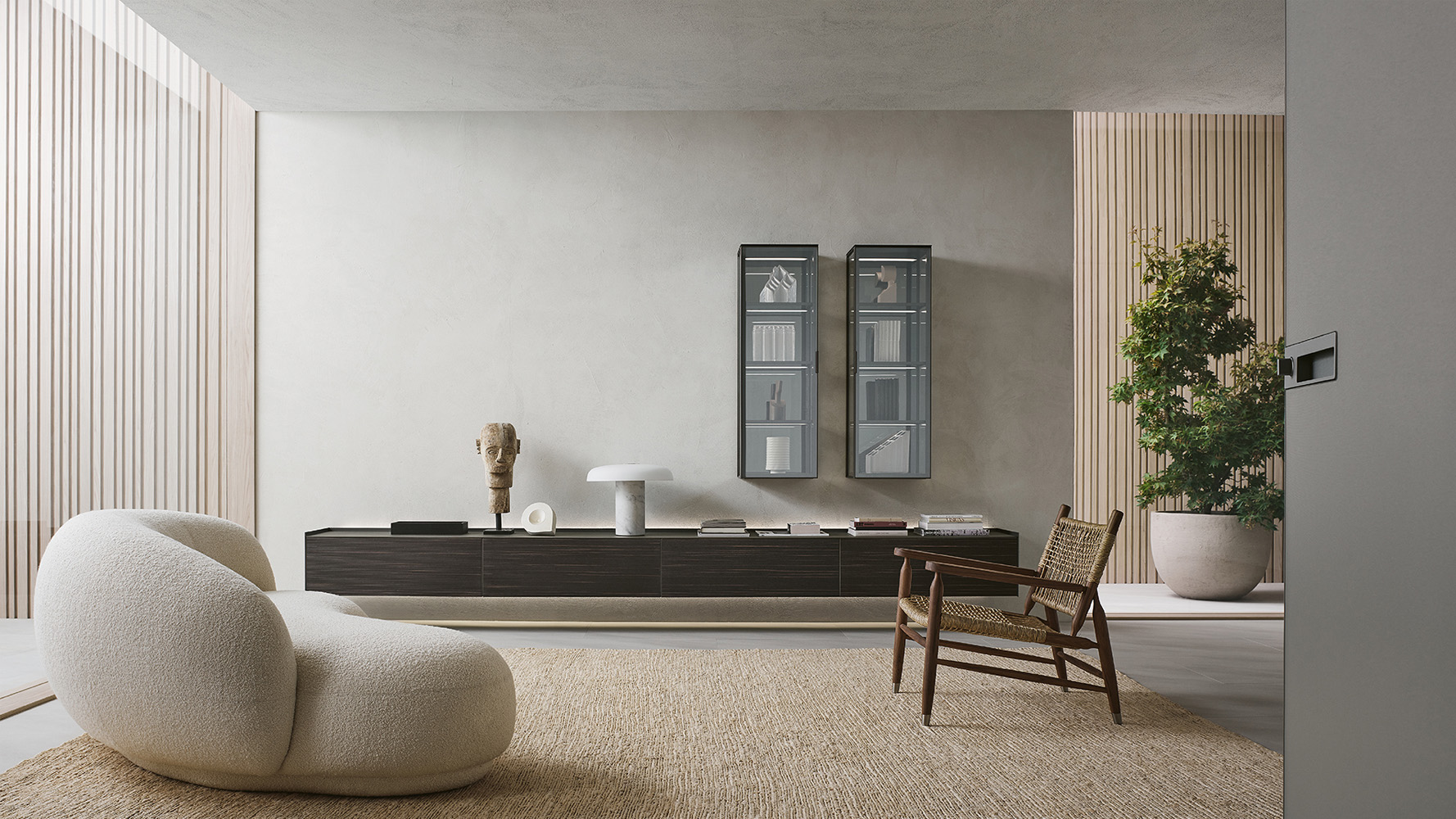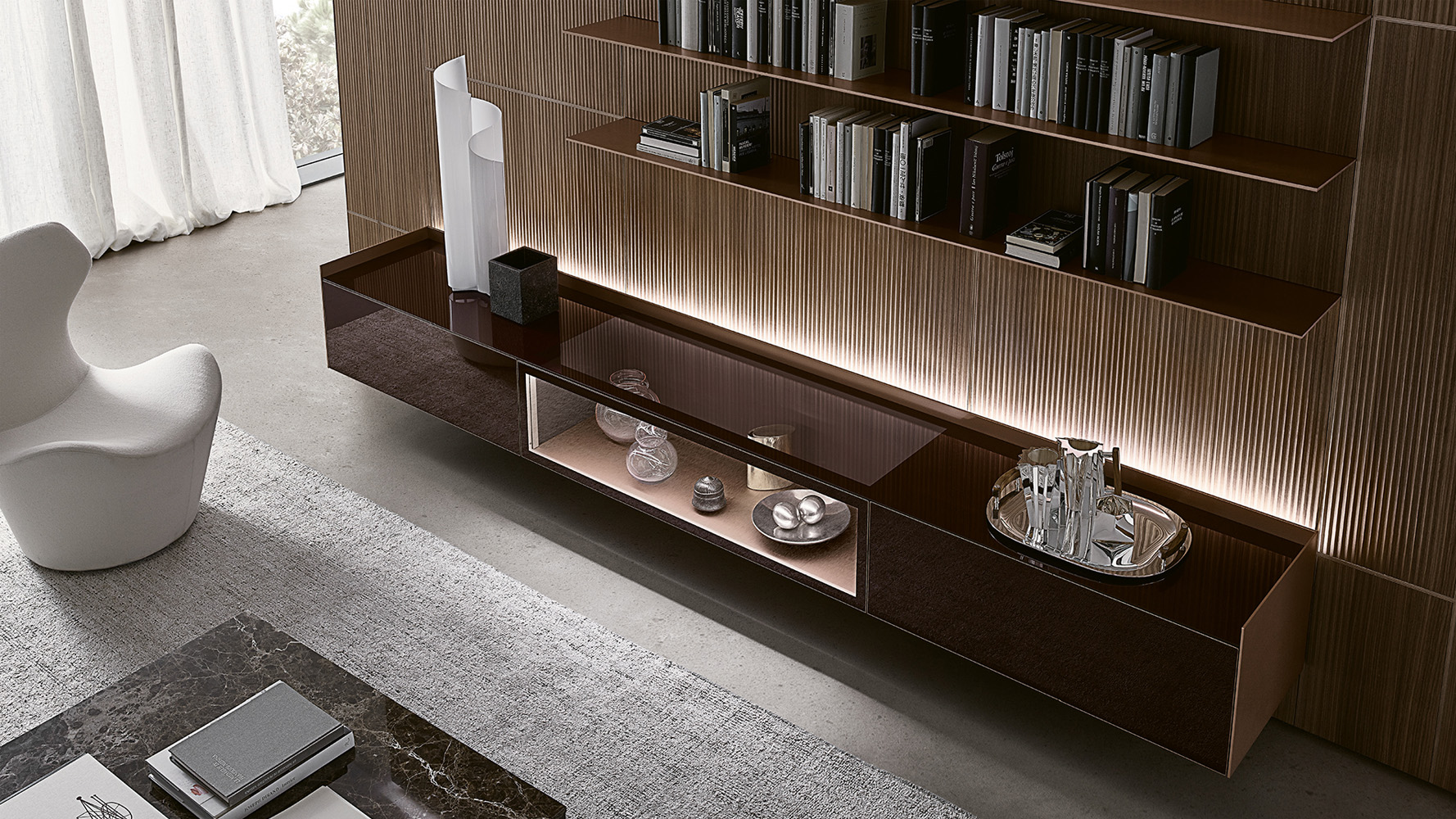 Self Bold интегрируется в интерьеры гостиной зоны, где требуется подвесная система хранения с выразительной архитектурной геометрией и минималистичной эстетикой.