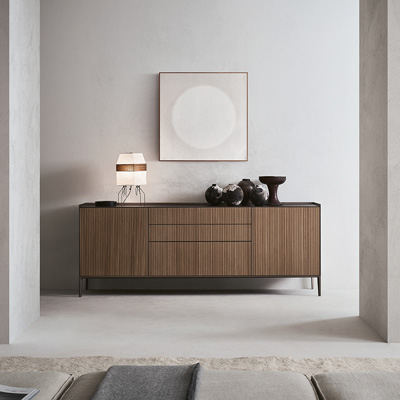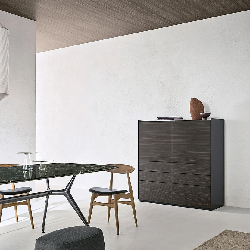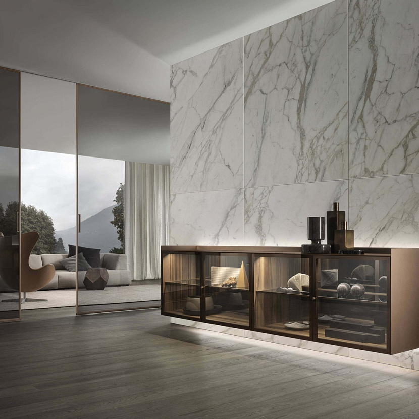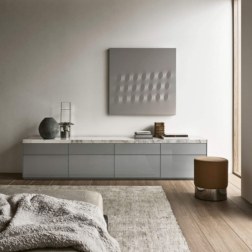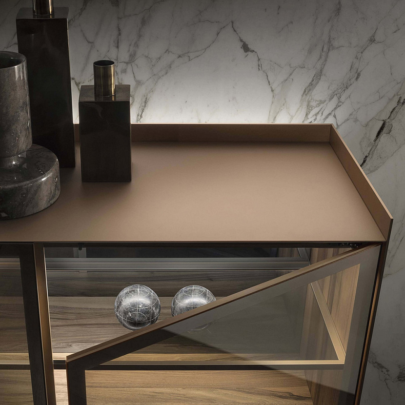 Особенность модели — характерная конструкция верхней части: задняя панель и боковые профили выступают выше фасадов, формируя своеобразную рамку вокруг столешницы. Этот графический элемент подчёркивает композицию мебели и может дополняться столешницей из стекла или массивной мраморной плитой, усиливая выразительность предмета.