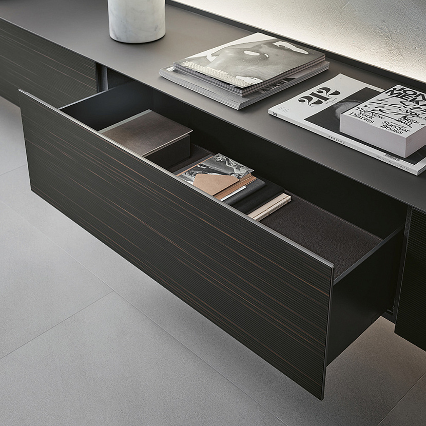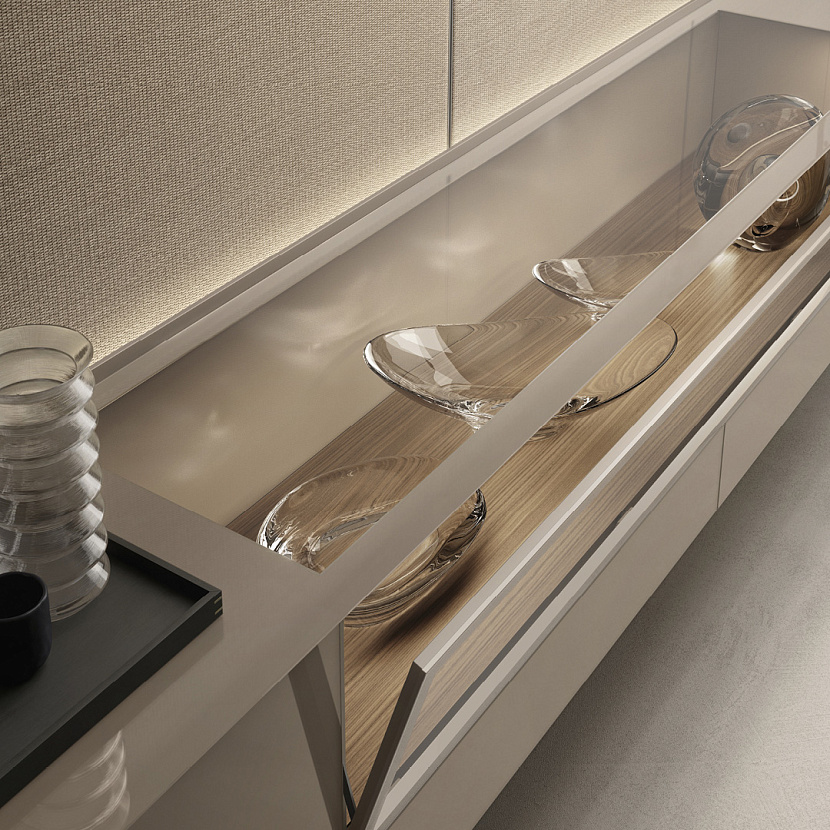 Система оснащается ящиками и модулями с откидными фасадами, открывающимися по системе push-open с плавным закрыванием. Благодаря модульной конструкции Self Bold может использоваться как буфет, подвесная композиция или элемент системы хранения гостиной.