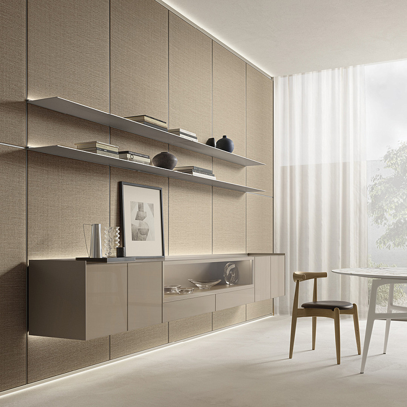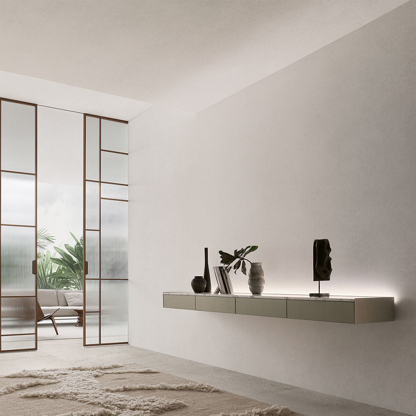 Подвесной модульный буфет с алюминиевой структурой и фасадами из лакированного стекла.