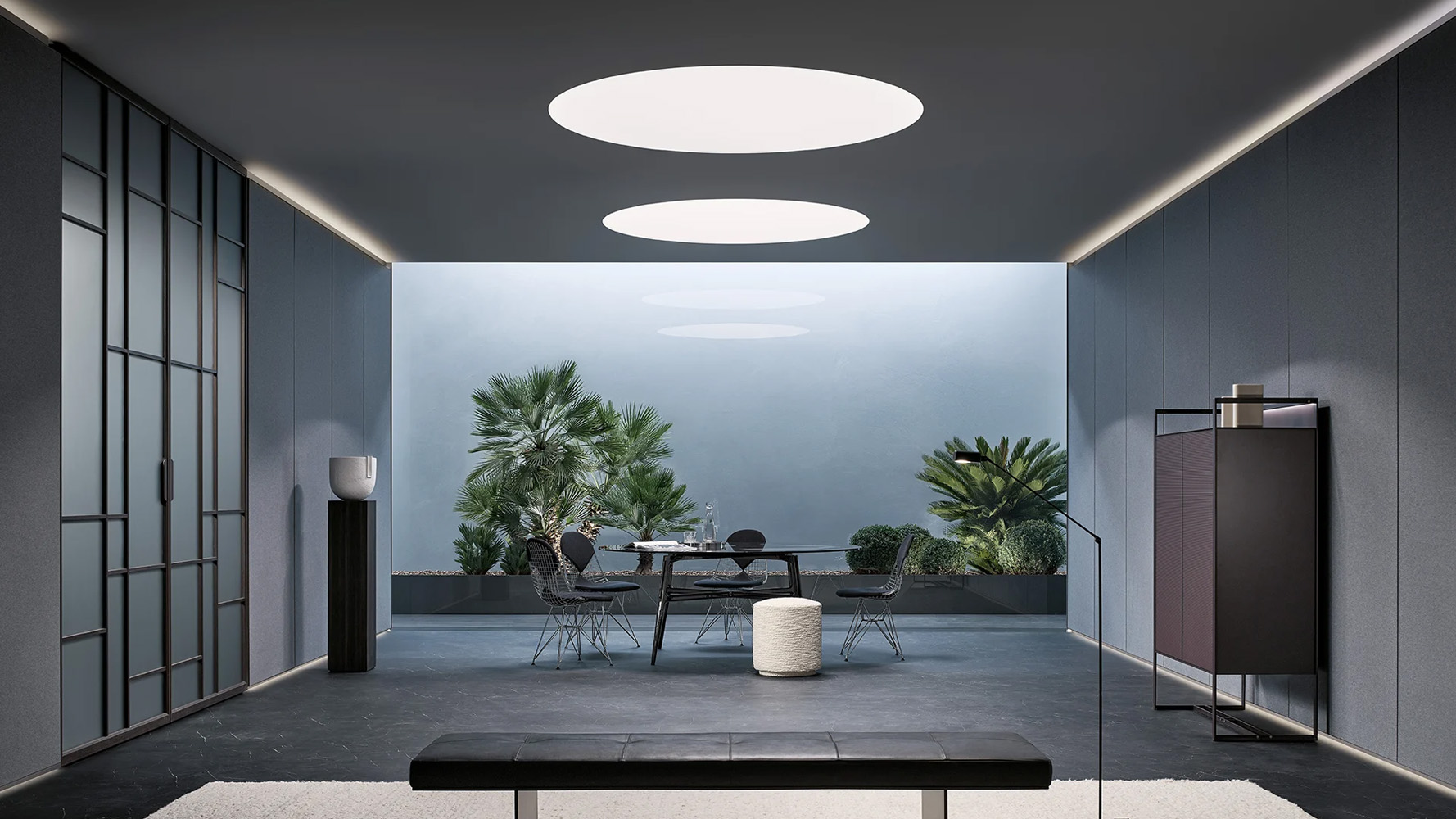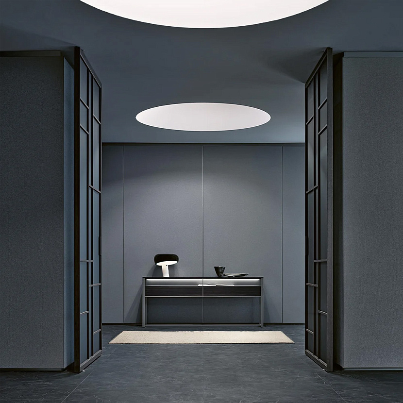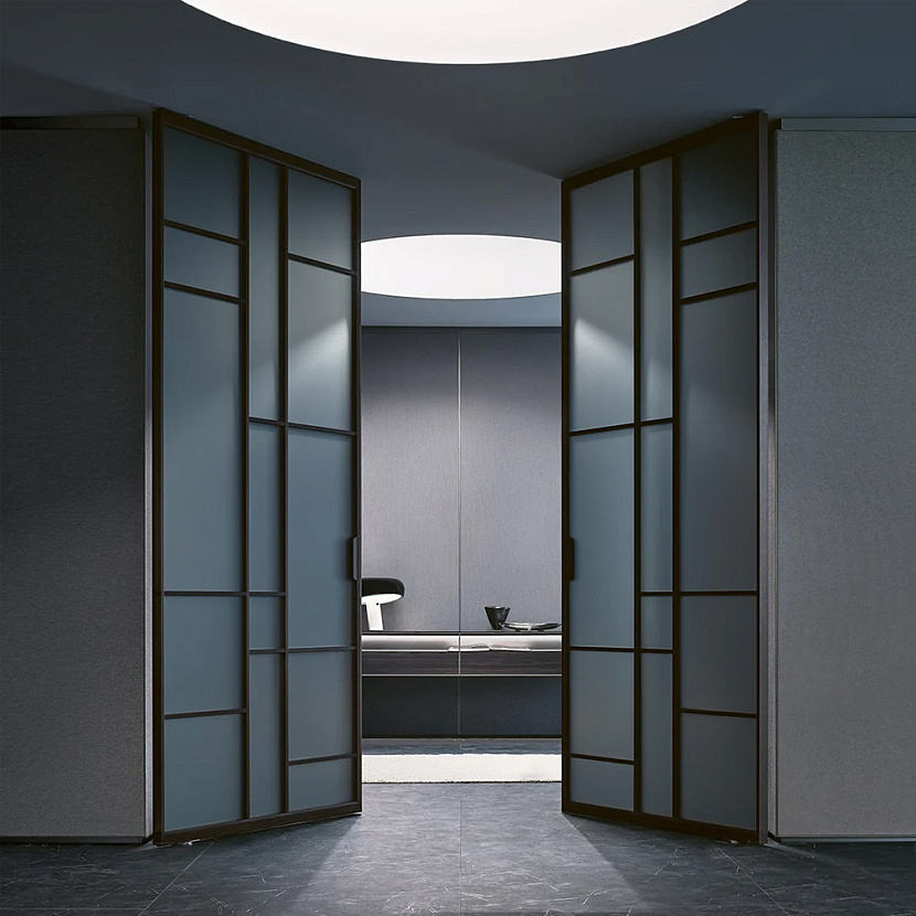 Это двусторонняя поворотная дверь Rimadesio, спроектированная для полной интеграции в архитектуру пространства. Конструкция построена на алюминиевых профилях и стеклянной панели и может устанавливаться без традиционного короба или интегрироваться в систему стеновых панелей Modulor, создавая непрерывную архитектурную плоскость.