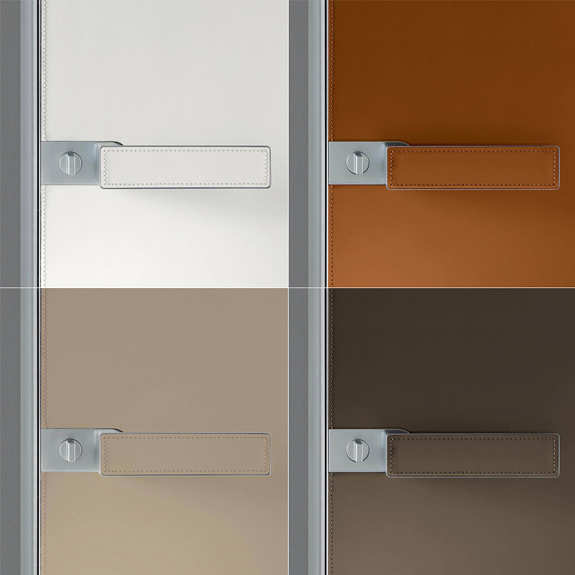 Версия на всю высоту помещения и широкий выбор материалов — стекло, Litech, дерево, ткань, натуральная кожа и экокожа — позволяют адаптировать систему к различным архитектурным сценариям и стилям интерьера.