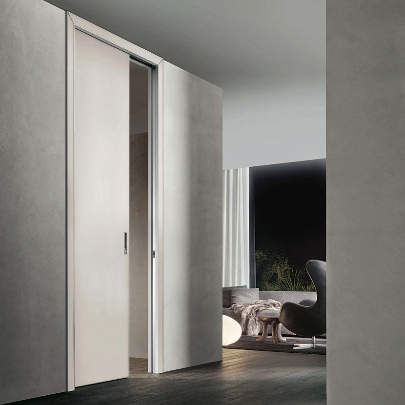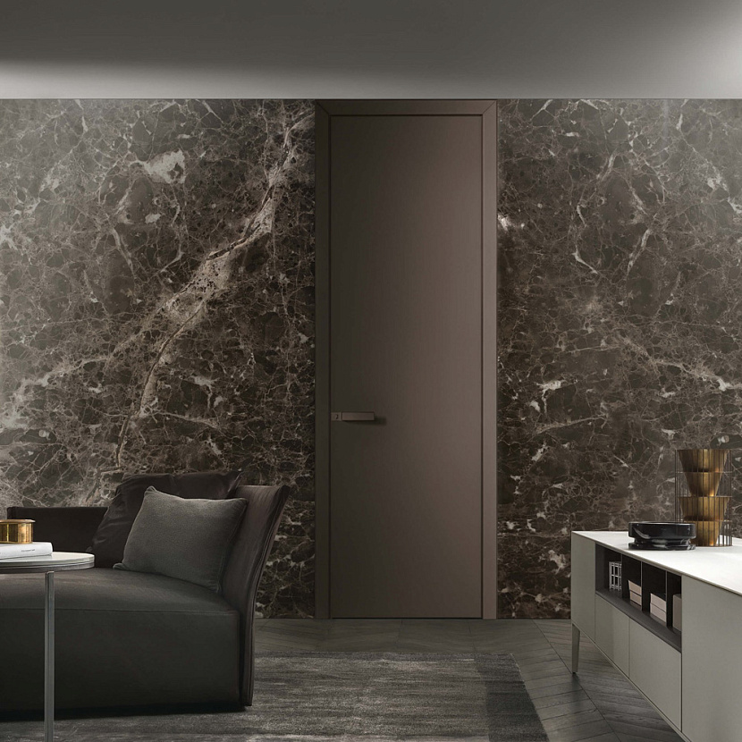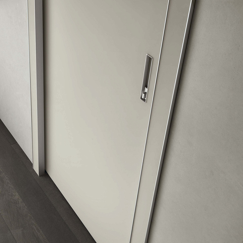 Это компланарная дверь Rimadesio, разработанная для максимальной интеграции двери в плоскость стены и архитектуру интерьера. Тонкий алюминиевый профиль и совпадение плоскости дверного полотна с коробом формируют цельную поверхность, благодаря чему дверь воспринимается как часть стены.