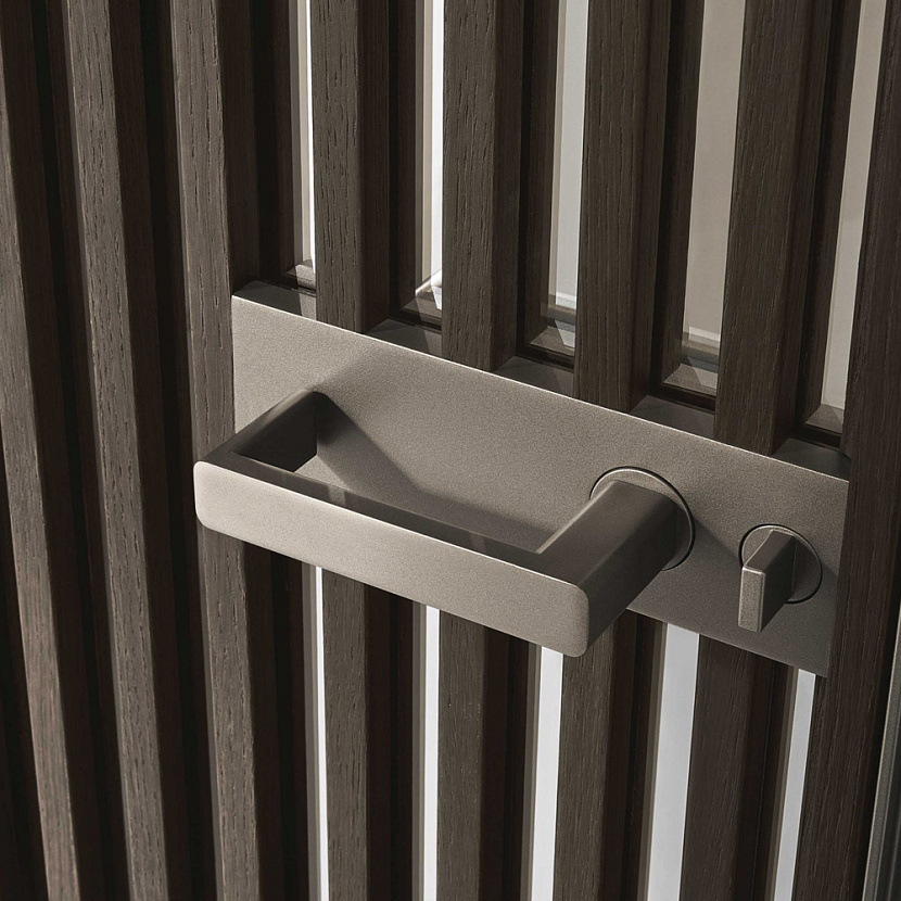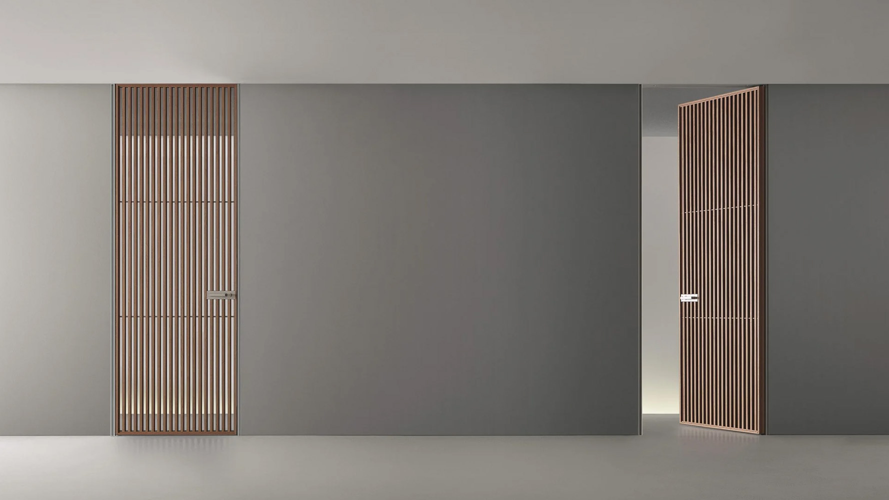 Широкий выбор вариантов стекла и отделок алюминиевых профилей, а также версии со шпоном ореха или термообработанного дуба позволяют адаптировать систему к различным архитектурным сценариям — от жилых интерьеров до общественных пространств.