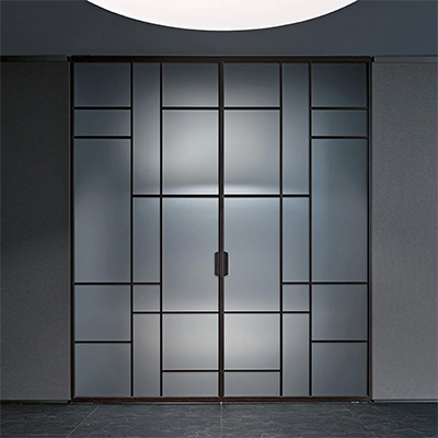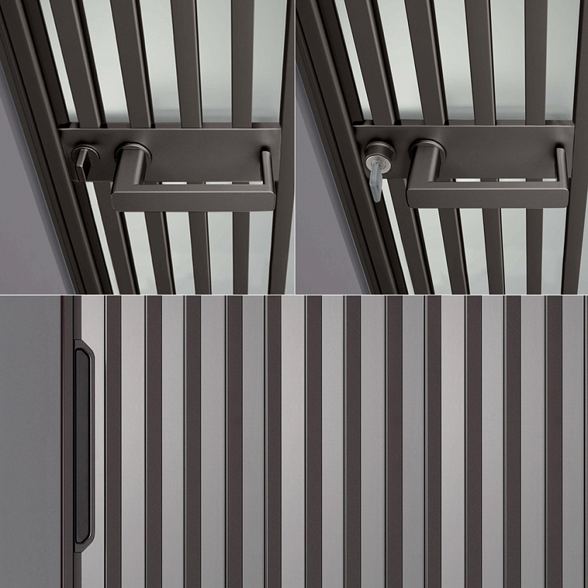 Конструкция двери основана на сочетании алюминиевого профиля и стеклянной панели, формирующих выразительную геометрию и лёгкую архитектурную структуру. Тщательная технологическая проработка и сложная сборка компонентов позволяют системе сочетать высокие технические характеристики с сильной визуальной выразительностью.