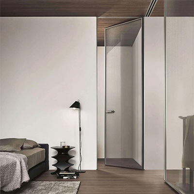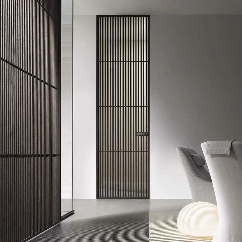 Sail интегрируется в интерьеры, где требуется минималистичная дверь с акцентом на графическую структуру алюминиевых профилей и прозрачность стеклянной панели.