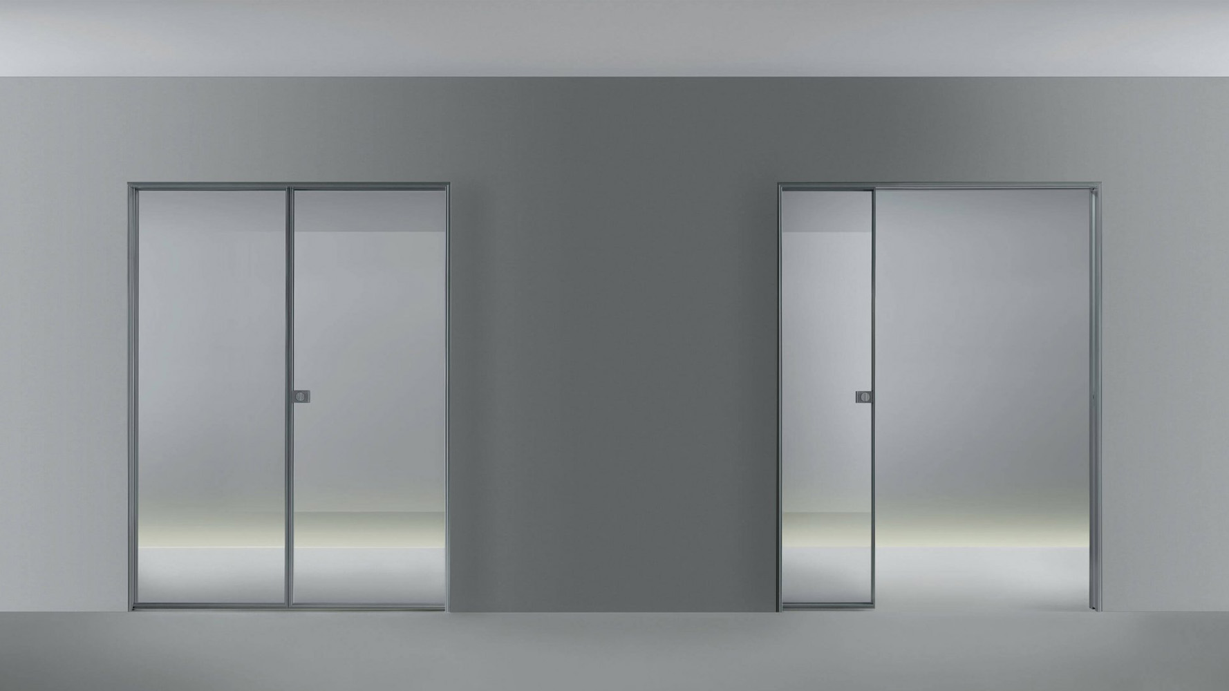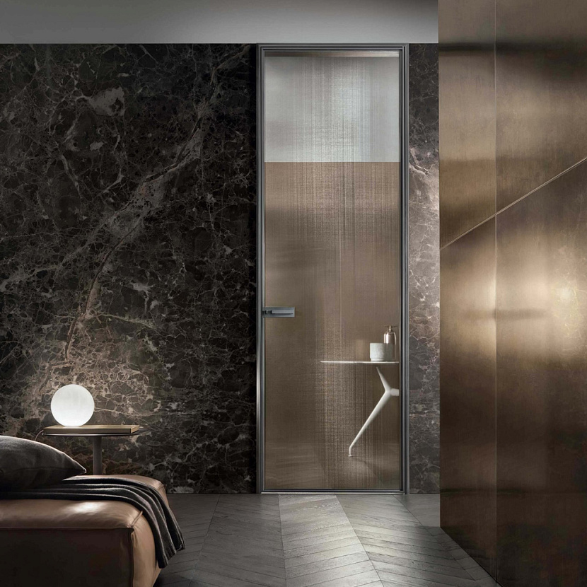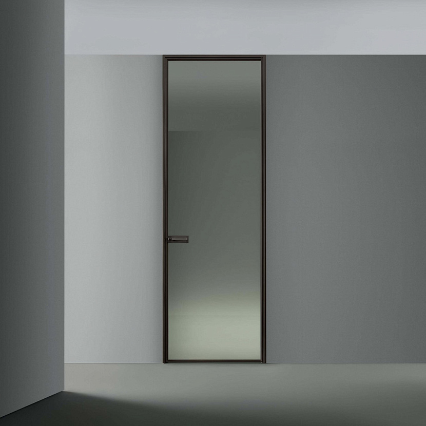 Конструкция двери построена на алюминиевом профиле уменьшенной толщины, который формирует чёткую рамку вокруг стеклянной панели и подчёркивает её цельную плоскость. Сдержанная геометрия конструкции и точность пропорций придают системе архитектурную выразительность и позволяют использовать дверь как элемент композиции интерьера.