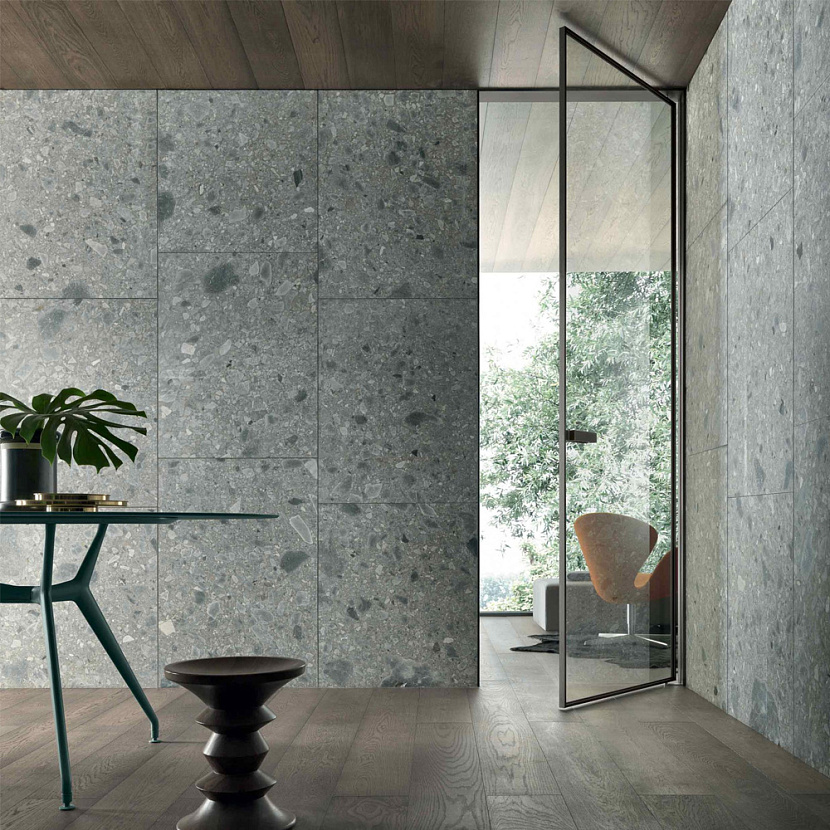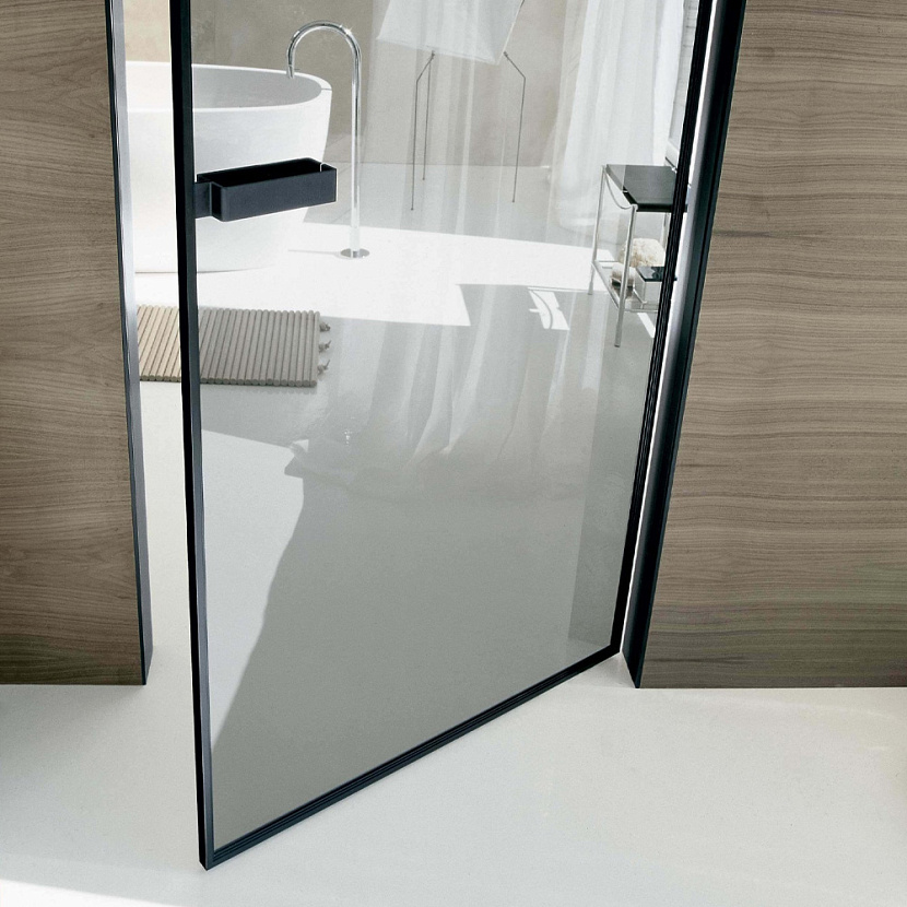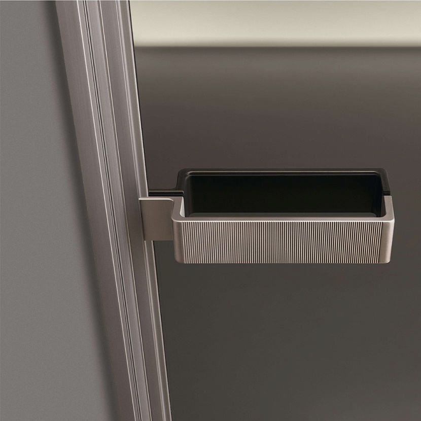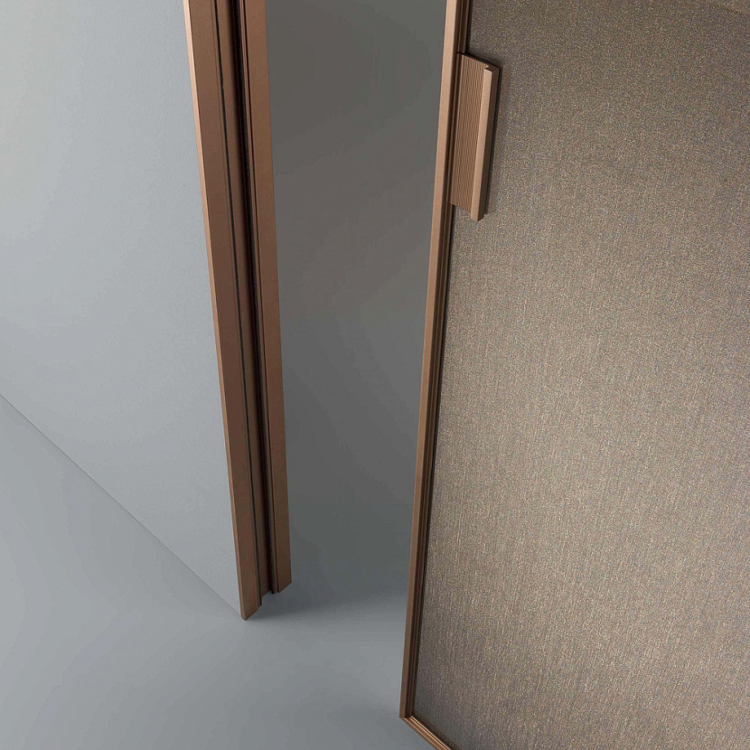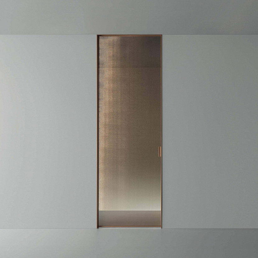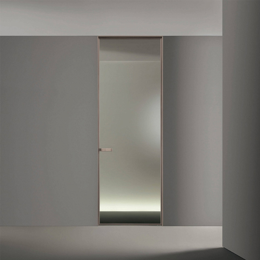 Конструкция двери построена вокруг стеклянной панели, воспринимаемой как единая плоскость, интегрированная в стену. Короб устанавливается заподлицо и становится практически незаметным, благодаря чему дверь воспринимается как продолжение архитектурной поверхности интерьера.