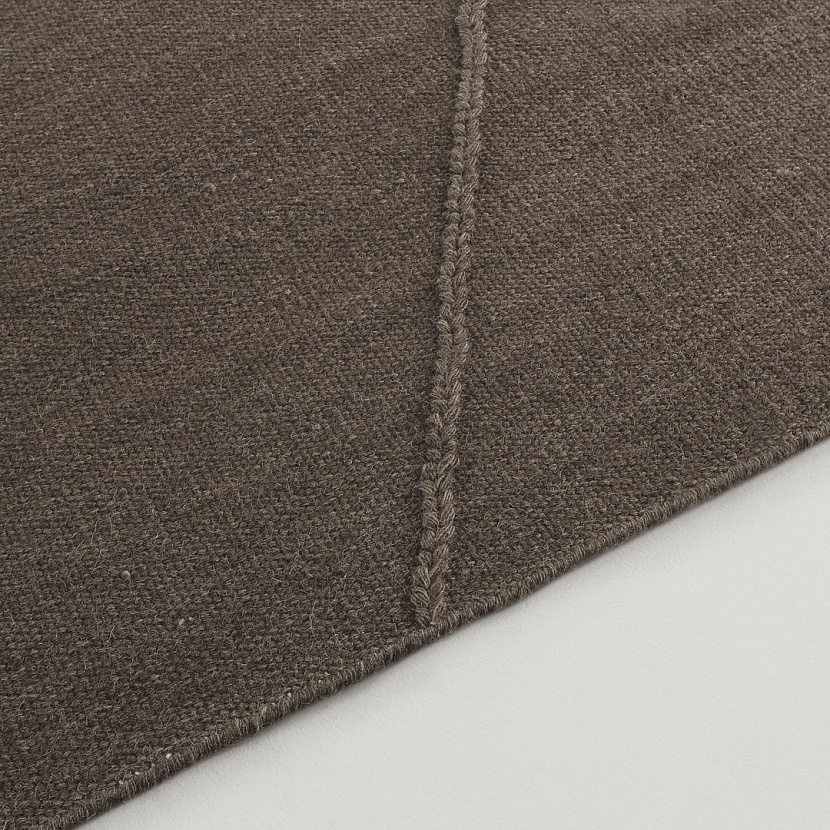 Ковер выполнен вручную с использованием техники kilim. Центральный рельефный элемент формируется непосредственно из нитей основы и напоминает линию горного хребта, создавая графическую структуру поверхности.