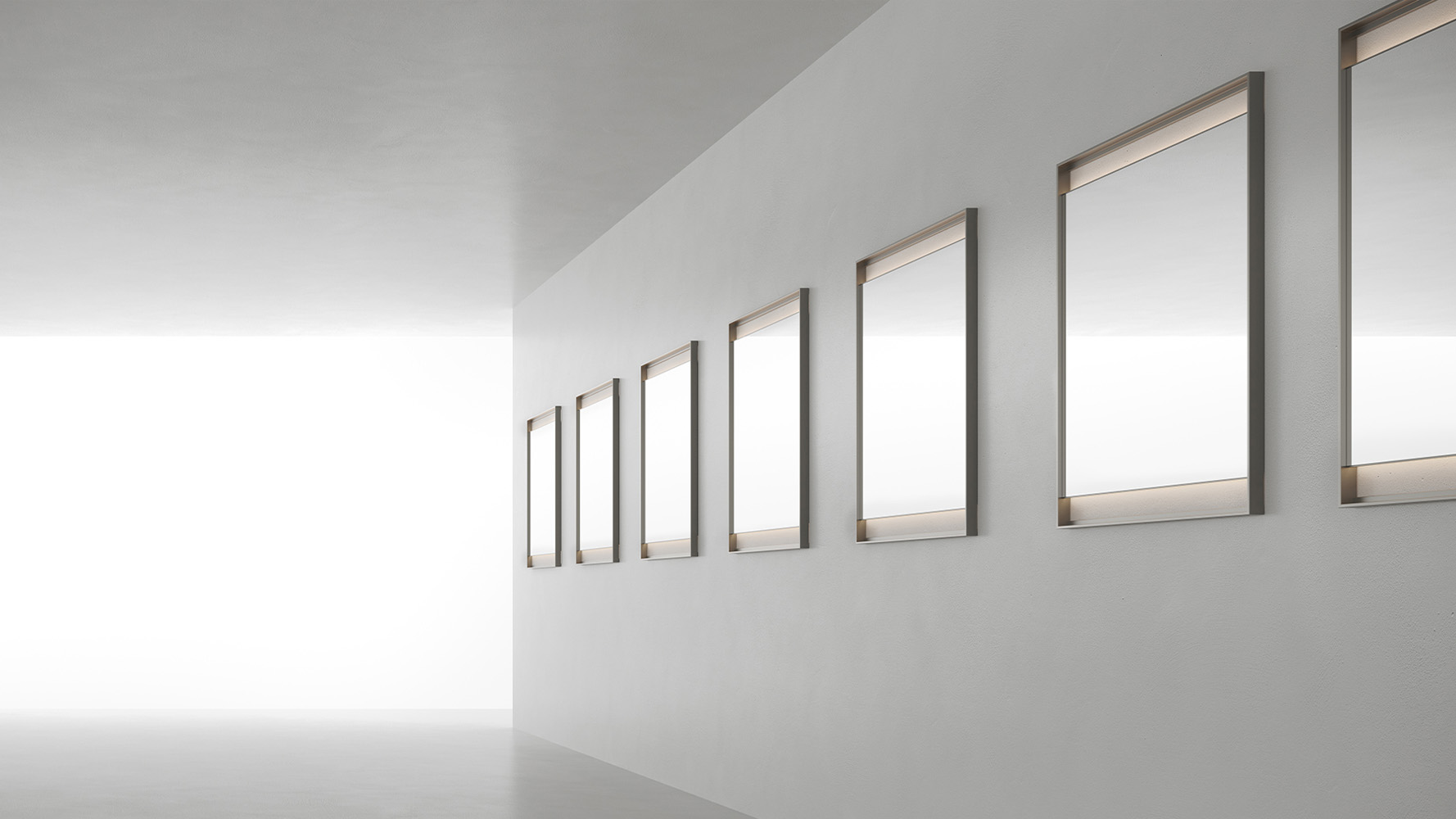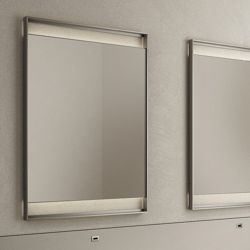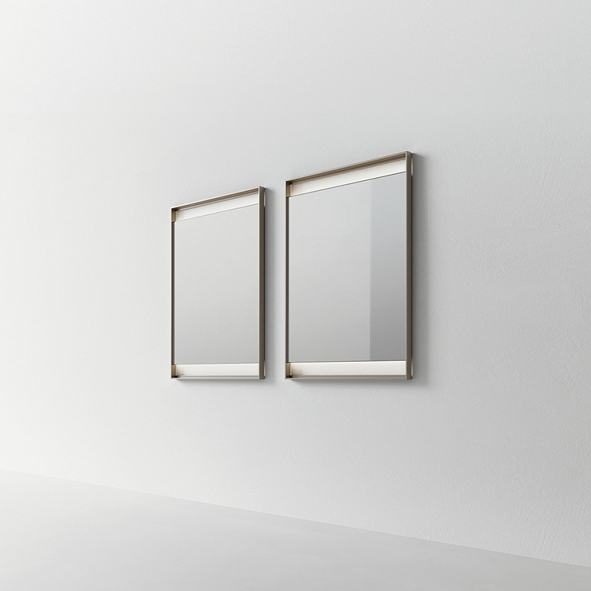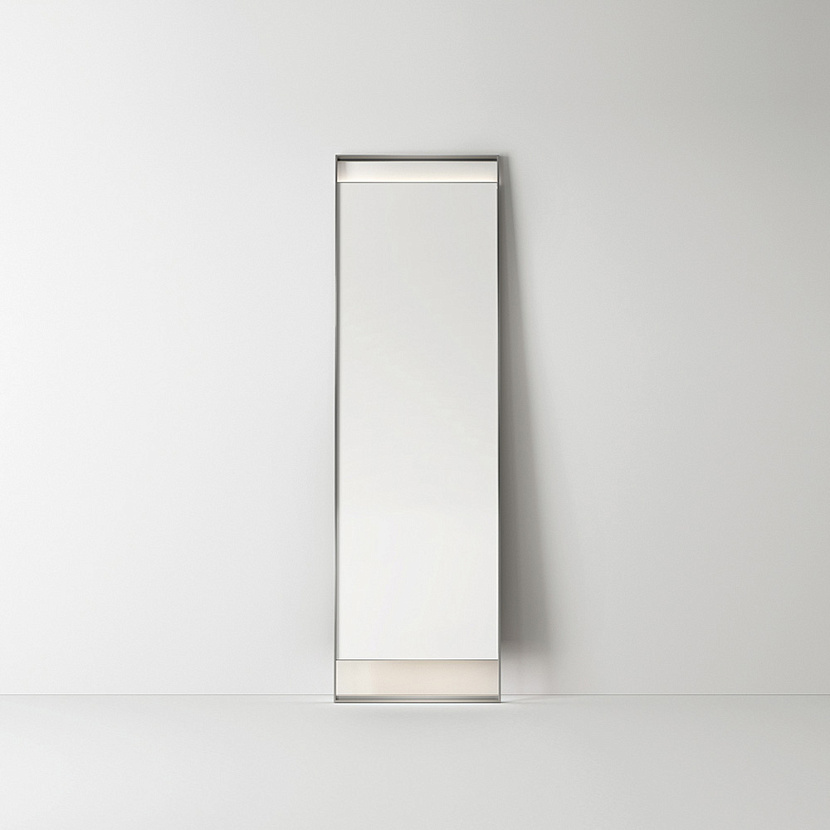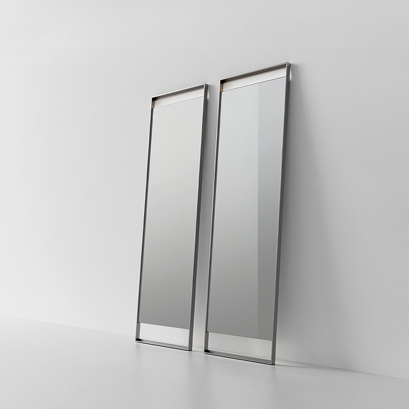 Зеркало с рамой из экструдированного алюминия и отражающей поверхностью из зеркального стекла. Доступны версии для настенного монтажа или напольной установки.