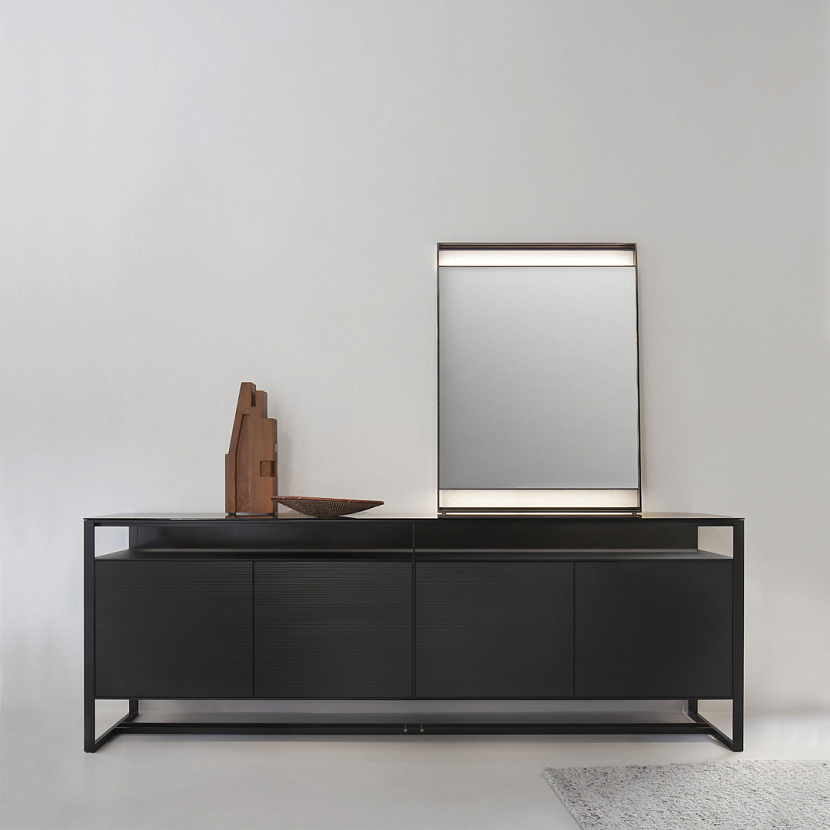 Зеркало выполнено в прямоугольной форме и обрамлено характерным алюминиевым профилем L-образного сечения, который является ключевым элементом всей коллекции Rialto. Лаконичная геометрия и тонкая металлическая рама формируют лёгкую графическую структуру, позволяющую использовать зеркало в гостиных, спальнях, гардеробных и общественных пространствах.