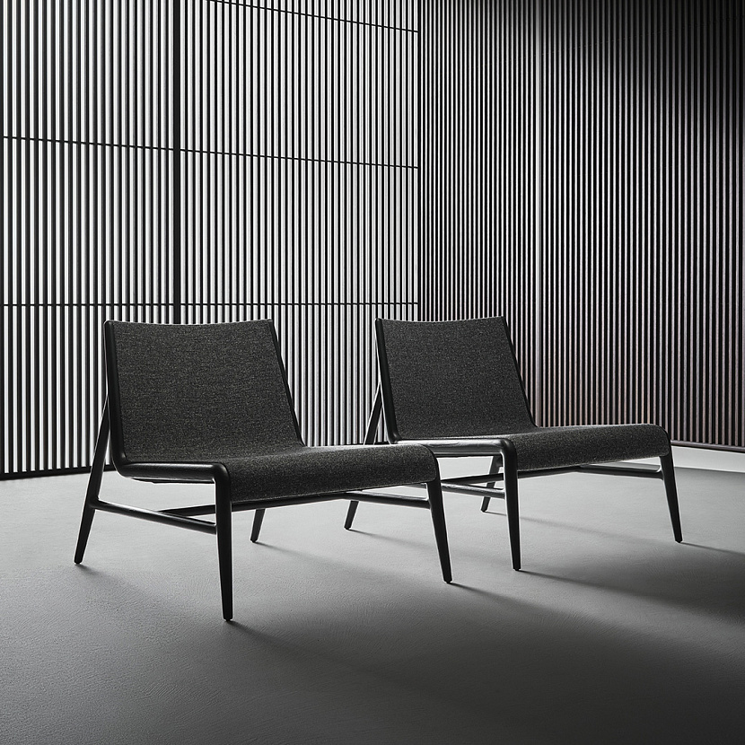Sinua Poltrona интегрируется в интерьеры гостиных и лаунж-пространств, где требуется кресло с выразительной деревянной конструкцией и мягкой посадкой.