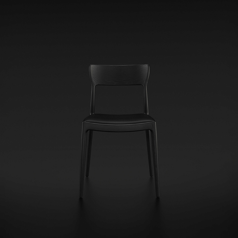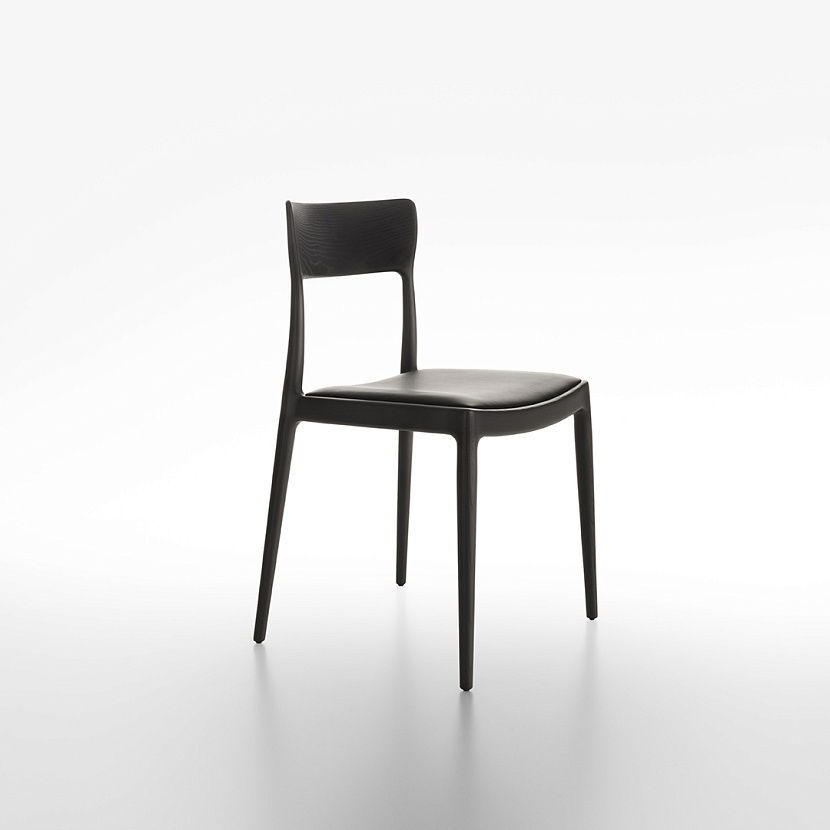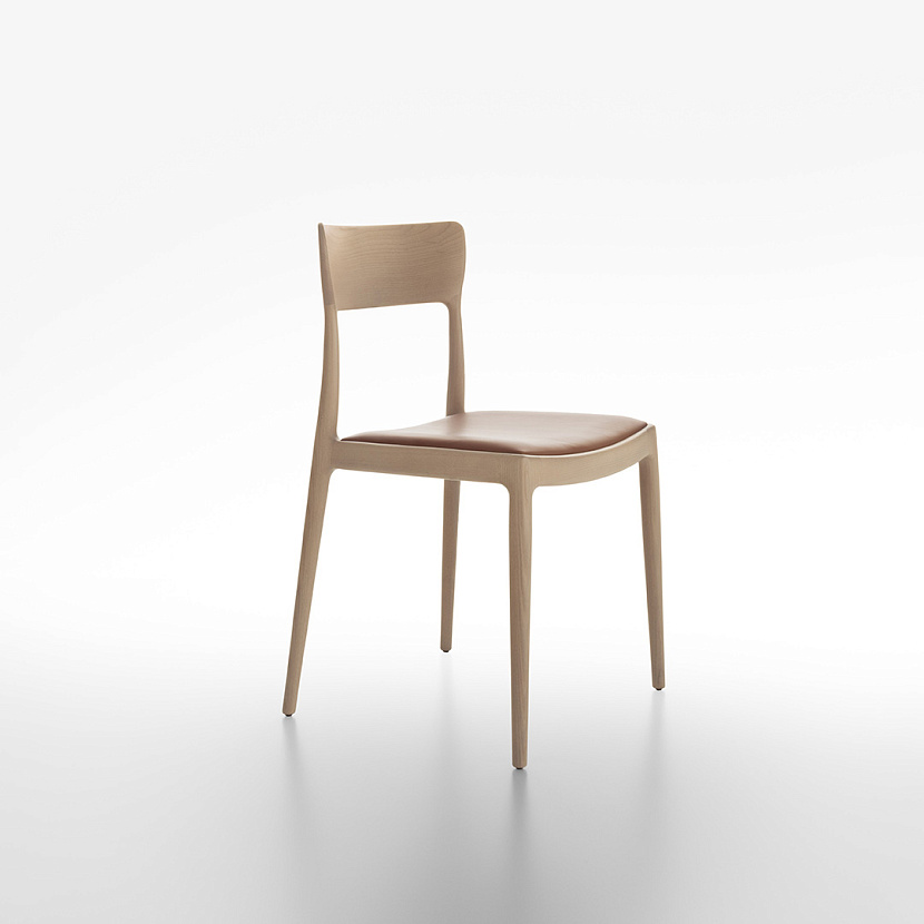 Стул с несущей рамой из массива дуба. Спинка и опоры объединены в единую конструкцию. Сиденье — мягкое, с обивкой из ткани или кожи.