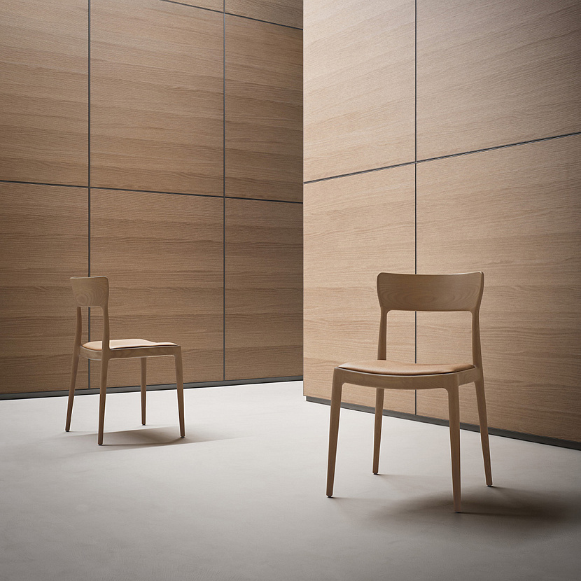 Sophis интегрируется в интерьеры столовых зон, кухонь и переговорных пространств, где требуется стул с выраженной деревянной конструкцией и мягкой посадкой.
