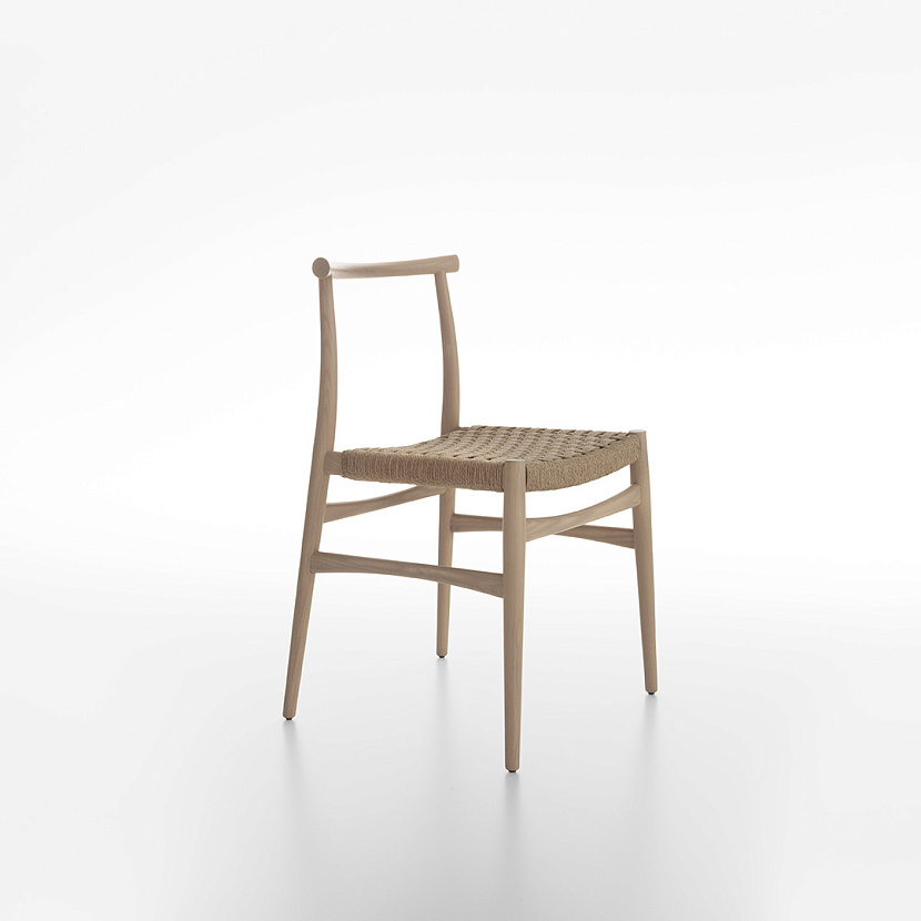 Стул с несущей рамой из массива дерева. Сиденье — плетёное из корда или кожаное, с внутренней системой поддержки для повышения комфорта.