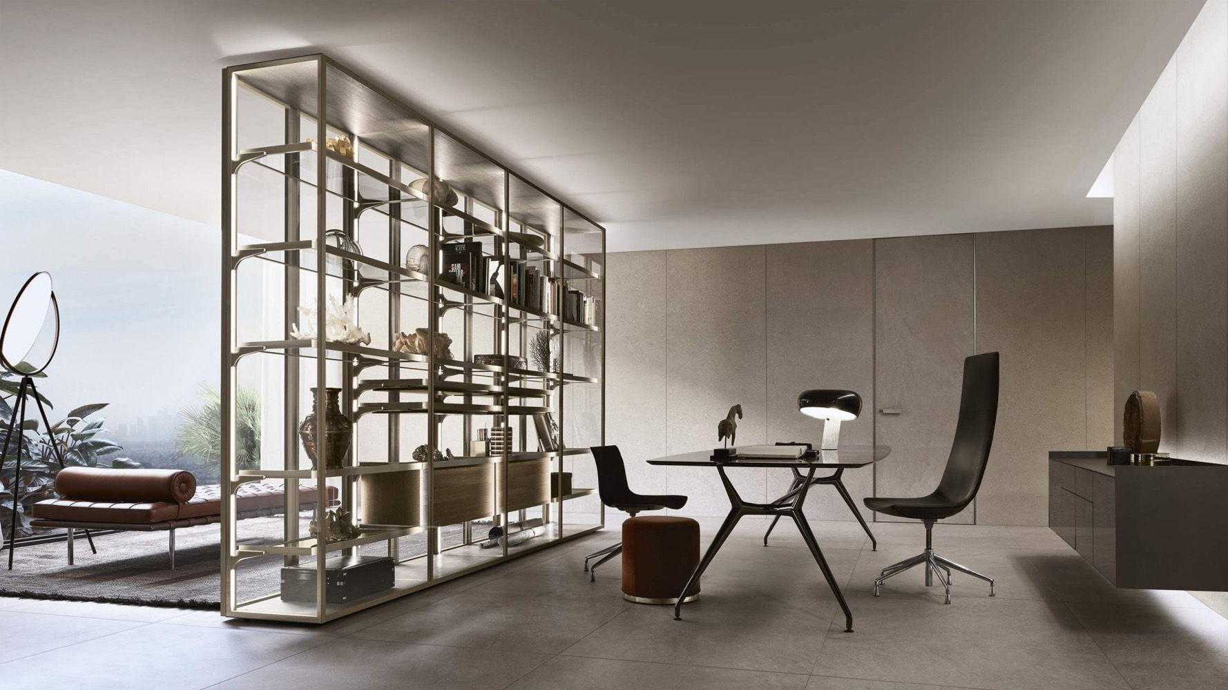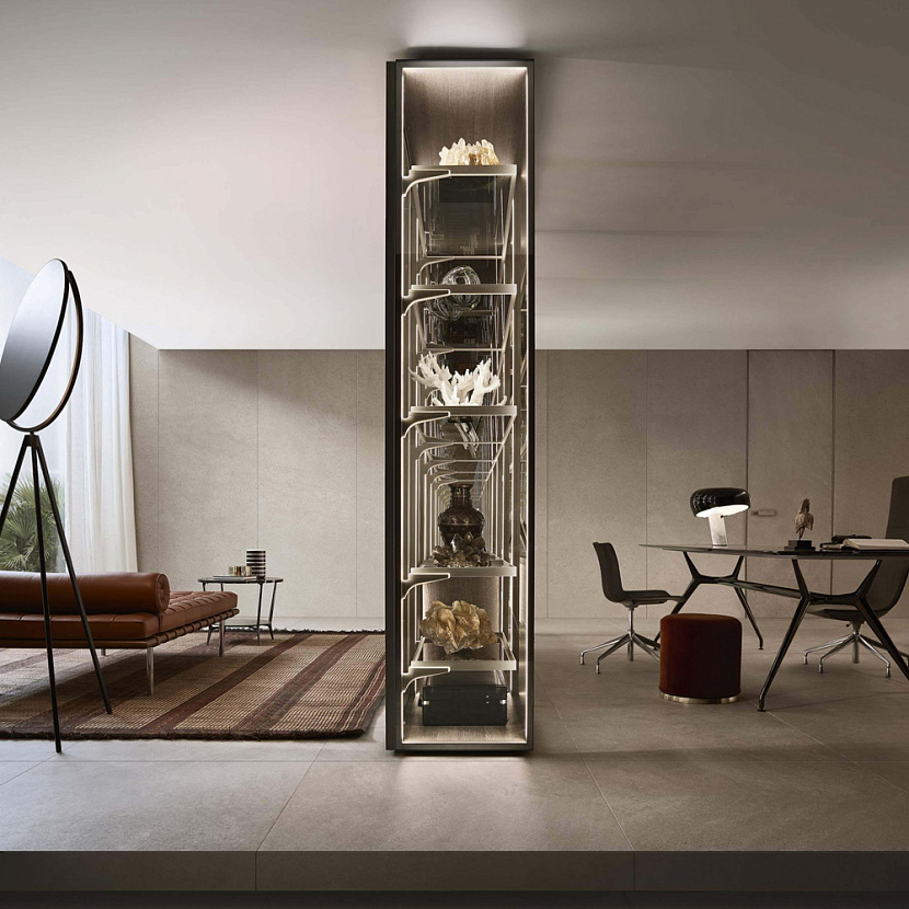 Cover Freestanding Day интегрируется в интерьеры гостиной зоны, где требуется отдельно стоящая архитектурная система хранения с чистой геометрией и высокой композиционной гибкостью.
