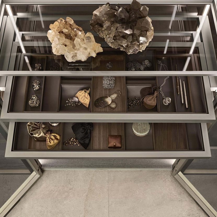 Конструкция основана на алюминиевых стойках, к которым напрямую крепятся двери и внутренние элементы — полки, ящики и аксессуары хранения. Все элементы фиксируются без видимых винтов, что обеспечивает чистую архитектурную поверхность и позволяет легко изменять конфигурацию системы со временем.