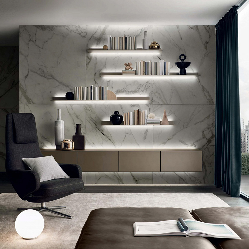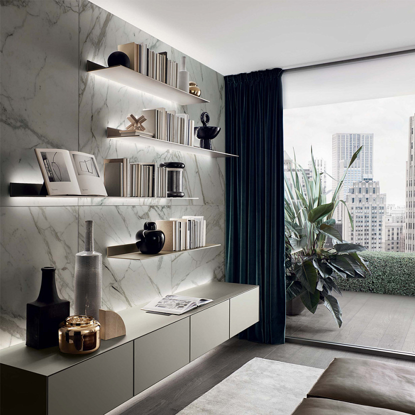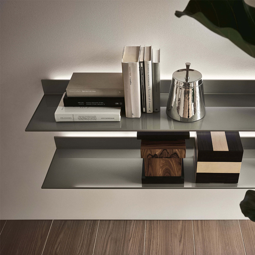 Профиль настенного крепления обеспечивает монтаж без видимых винтов. В конструкцию интегрирована система светодиодной подсветки, позволяющая использовать полки как функциональный и архитектурный элемент стены.
