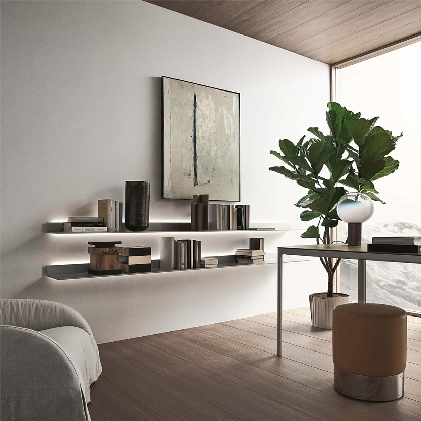 Система представляет собой серию настенных полок с алюминиевой рамой и тонкой рабочей поверхностью. Конструкция объединяет лакированное стекло или Litech с алюминиевым каркасом толщиной всего 8 мм, формируя визуально лёгкую горизонтальную линию в интерьере.