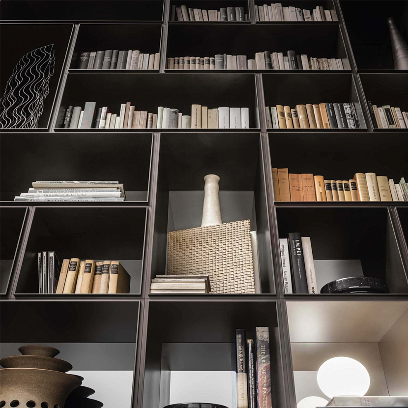 Система представляет собой модульную библиотеку, полностью выполненную из экструдированного алюминия и основанную на свободной композиции квадратных и прямоугольных элементов. Такая строгая геометрическая структура позволяет создавать книжные шкафы различных размеров и конфигураций, адаптированных к архитектуре пространства.