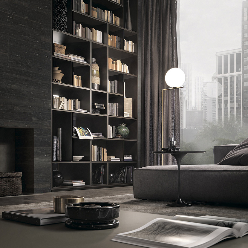 Opus интегрируется в интерьеры гостиной зоны, где требуется модульная система хранения, формирующая архитектурную композицию стены.