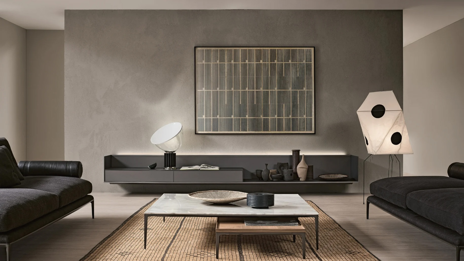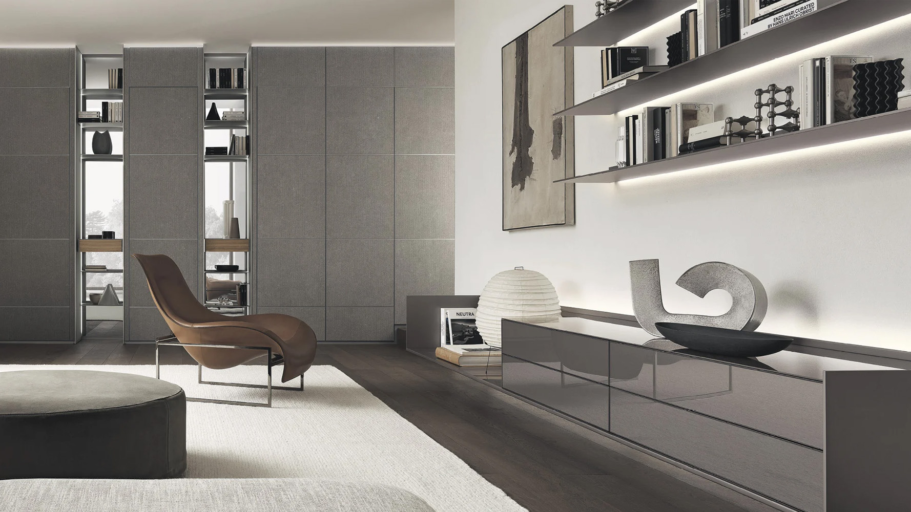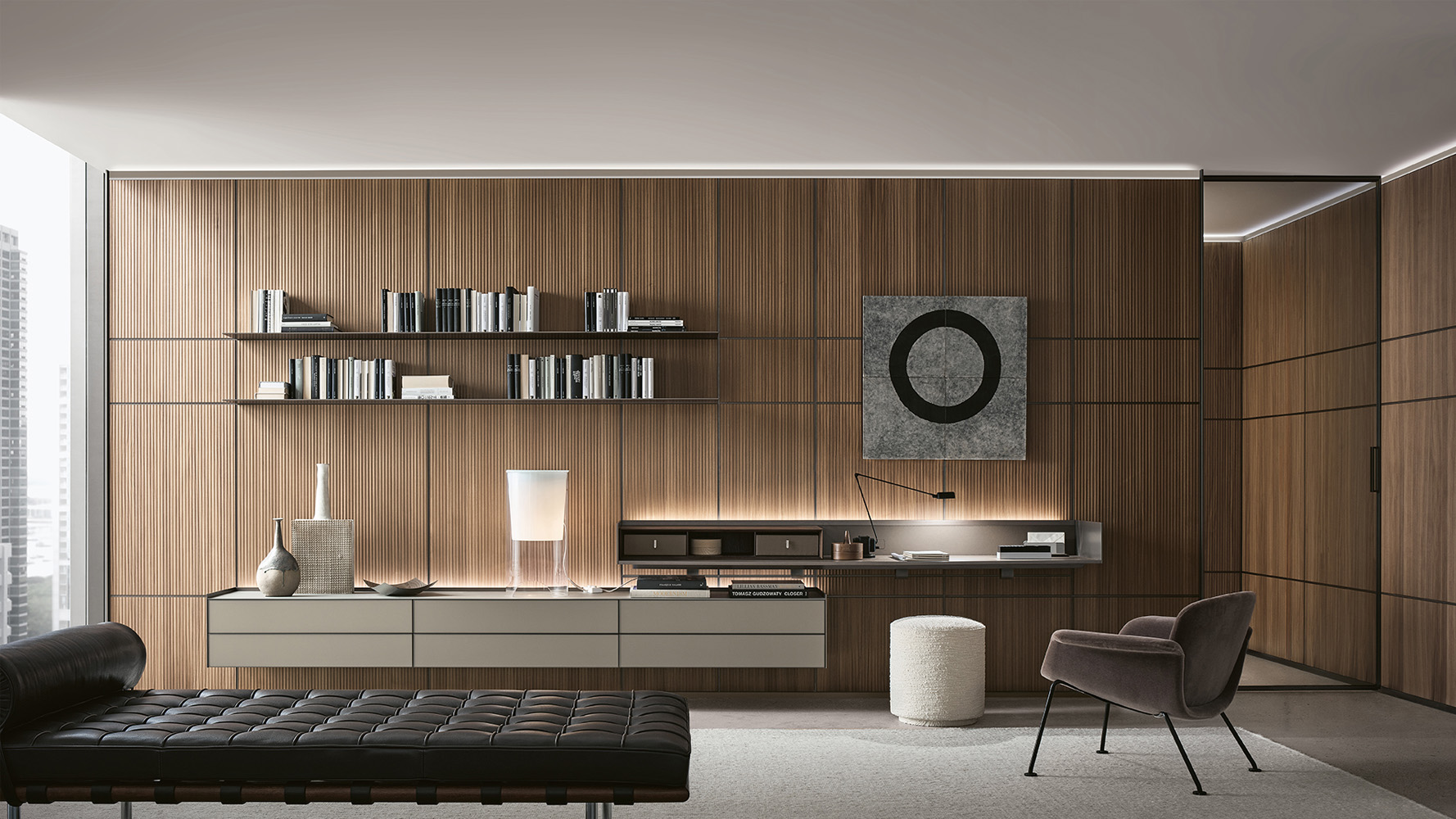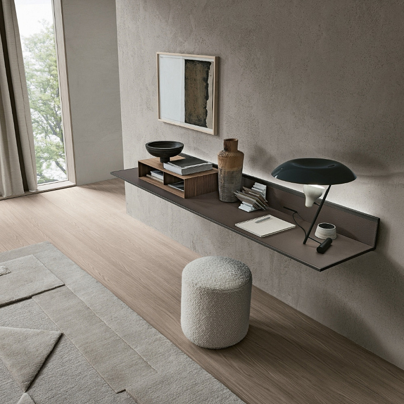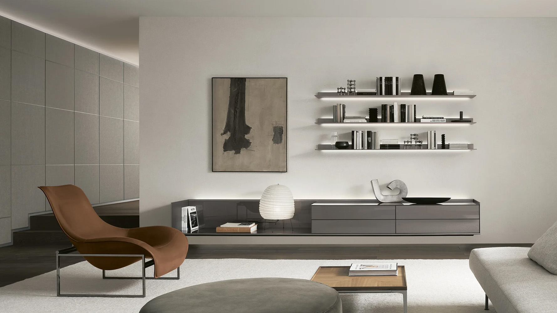 Self Plan интегрируется в интерьеры гостиной зоны, где требуется подвесная система хранения с лёгкой архитектурной конструкцией и высокой композиционной гибкостью.