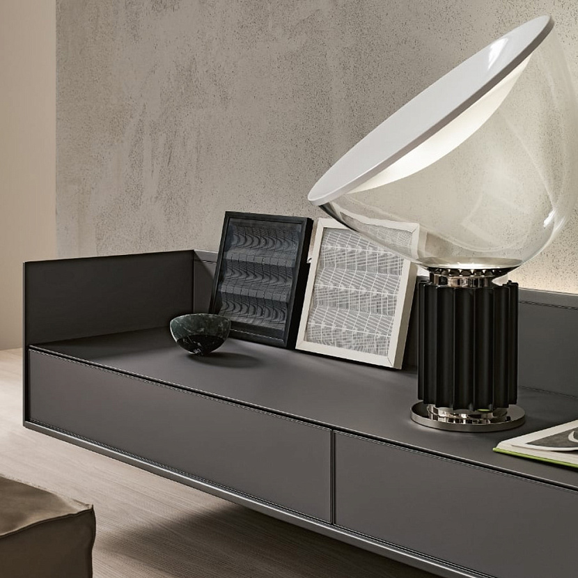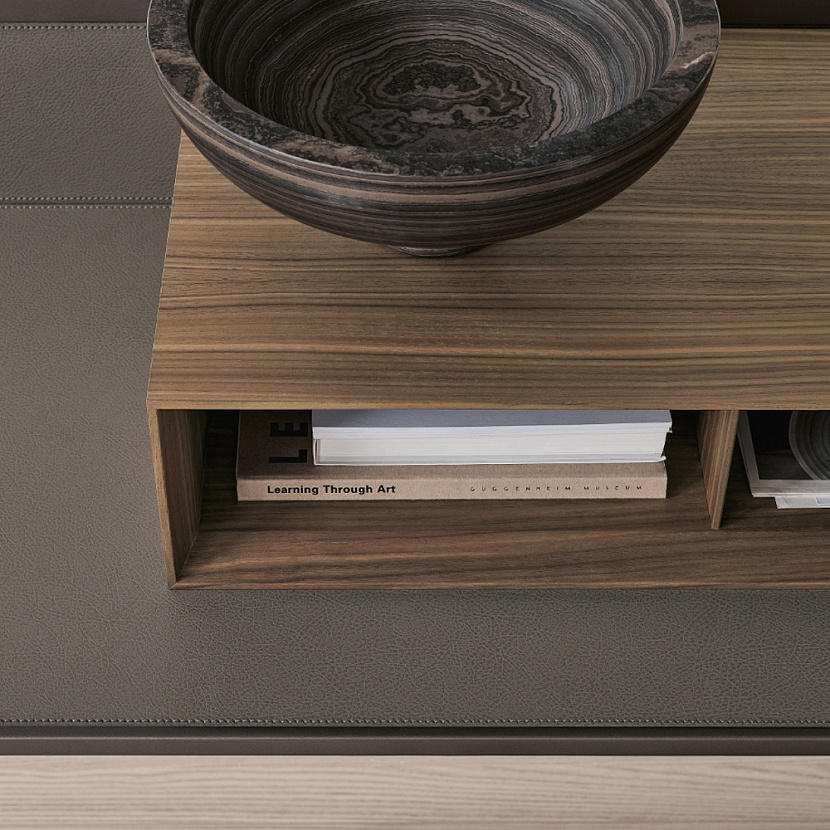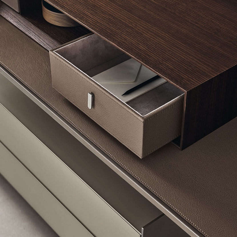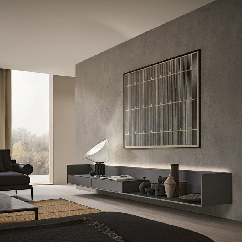 Система выполнена полностью из алюминия и основана на принципе горизонтальной модульности. На подвесных полках размещаются различные модули хранения — ящики, открытые ниши или элементы с откидными фасадами, формируя гибкую композицию для организации пространства гостиной.