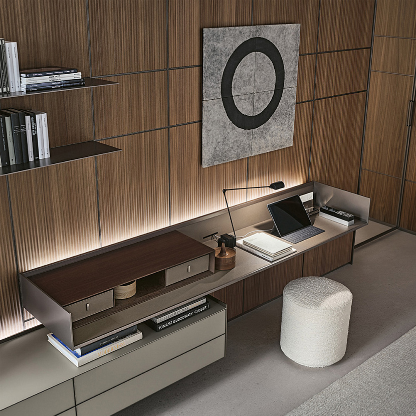 Self Plan может устанавливаться как самостоятельная настенная композиция или интегрироваться в систему стеновых панелей Modulor. Благодаря этому система легко адаптируется к различным архитектурным сценариям — от мебельных композиций гостиной до компактных рабочих зон.