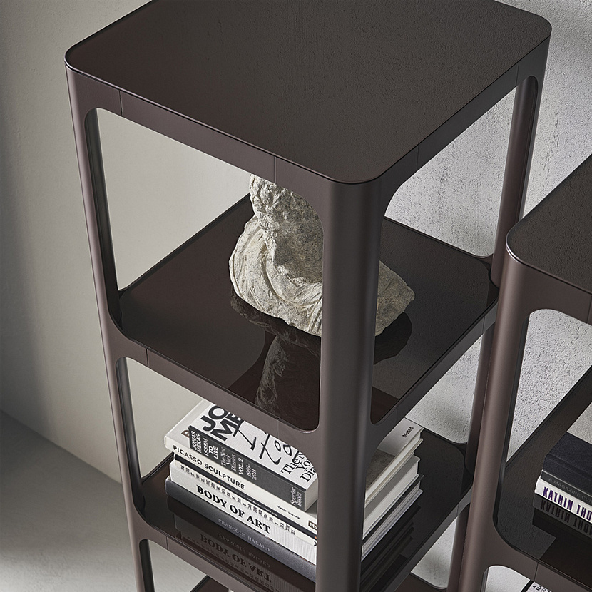 Модульный принцип позволяет создавать различные композиции — от компактных настенных решений до крупных стеллажей во всю стену. Полки могут выполняться из стекла или алюминия, что позволяет адаптировать систему к различным архитектурным сценариям жилых и общественных интерьеров.