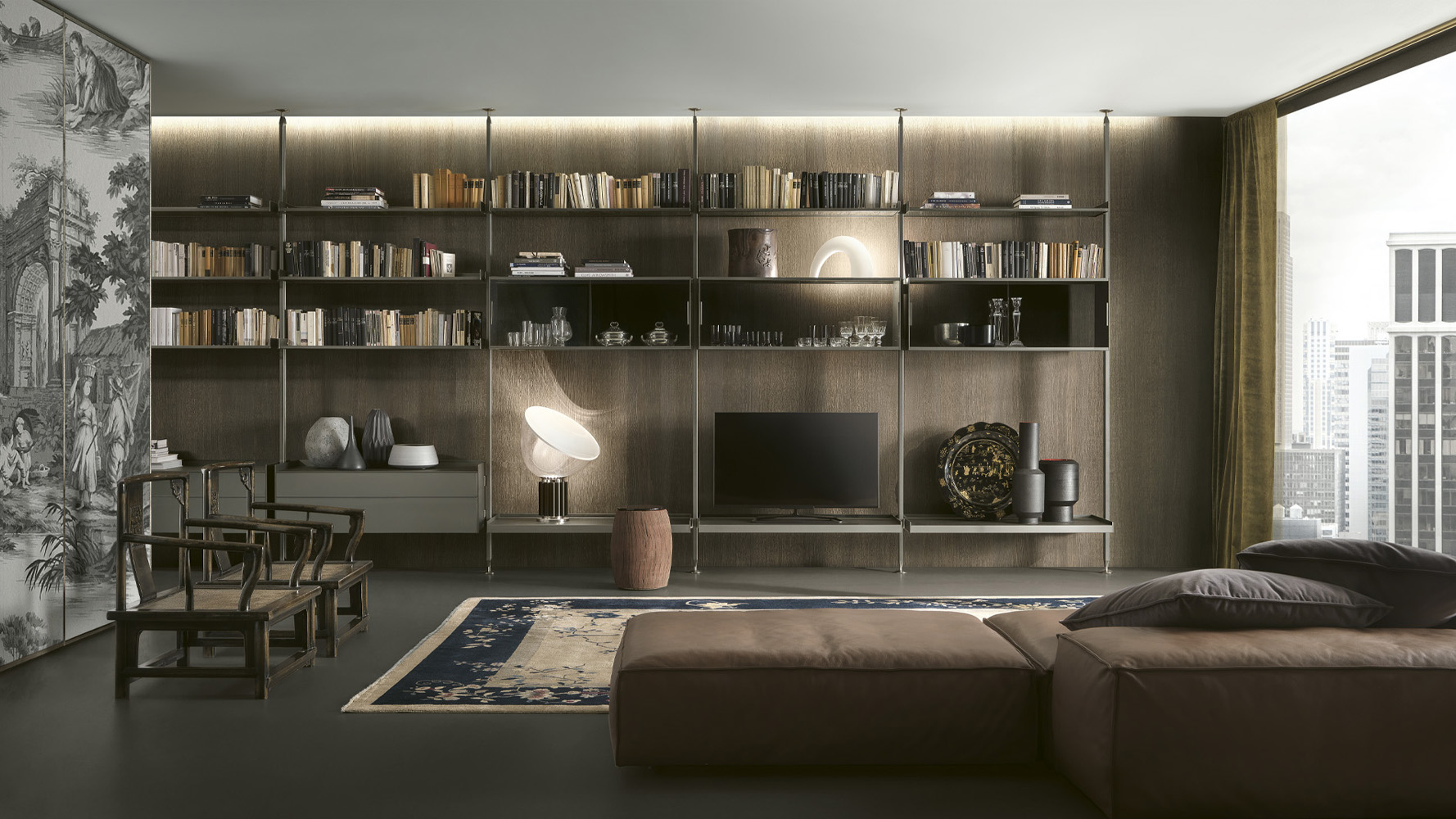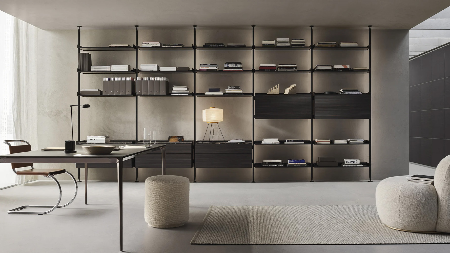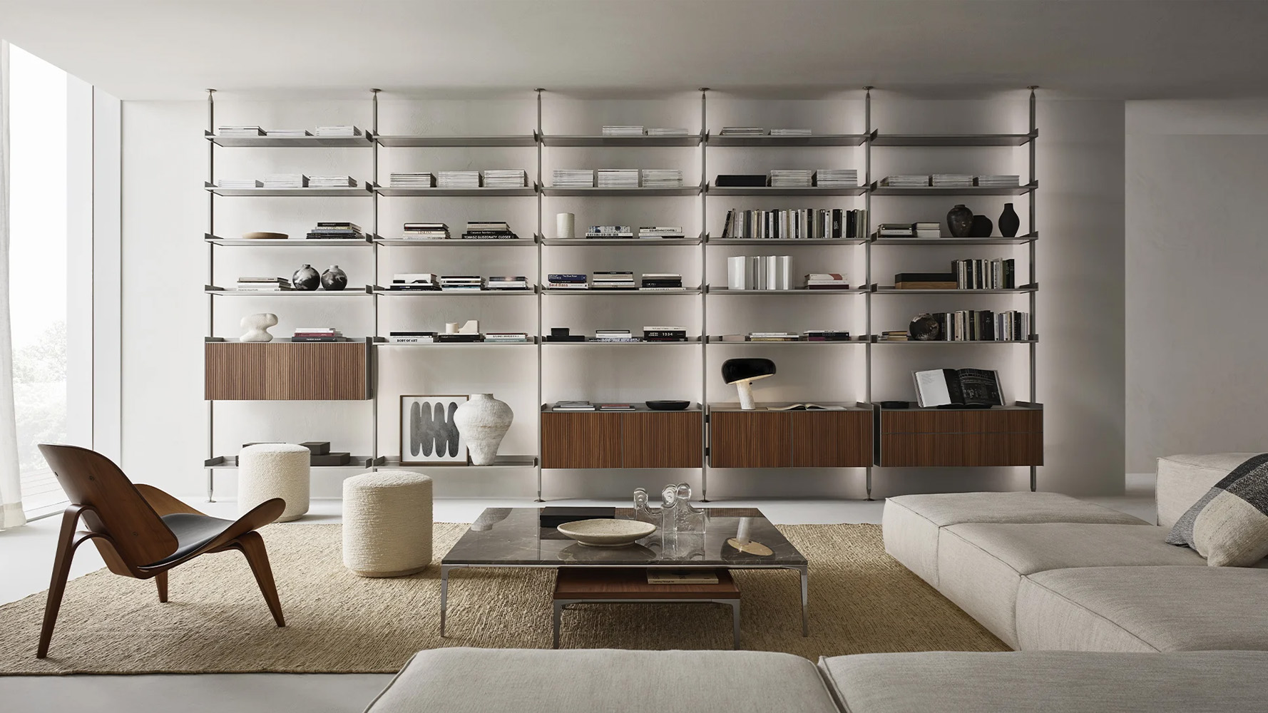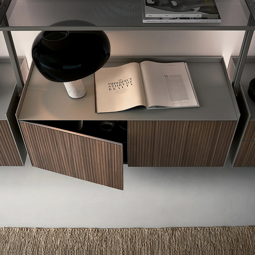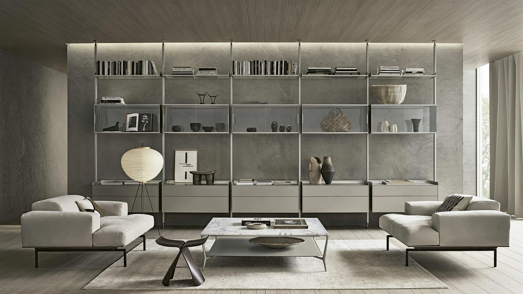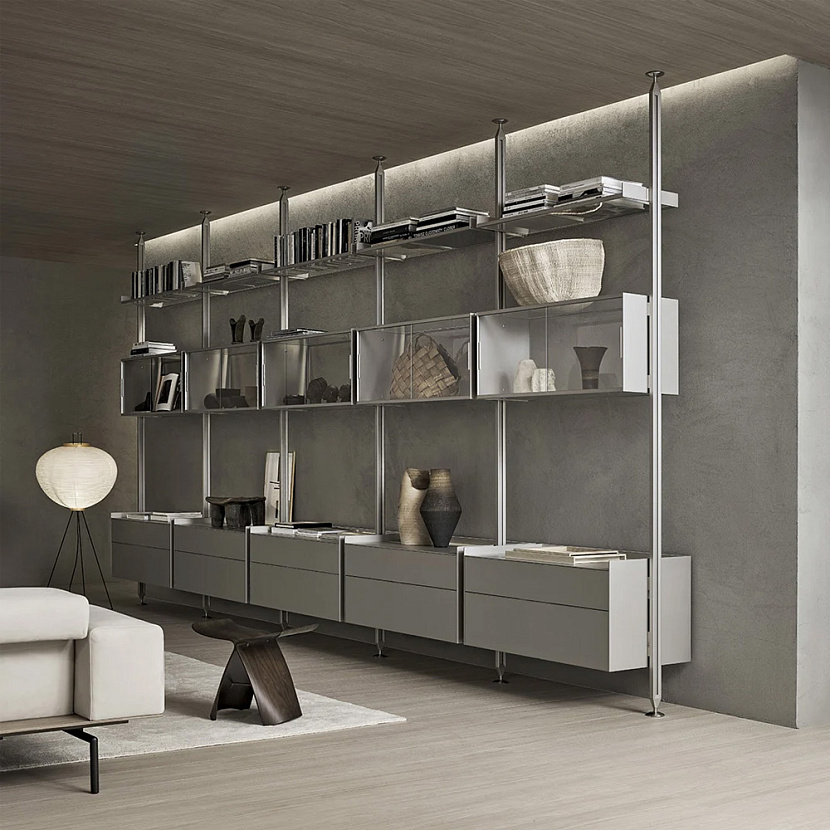 Zenit интегрируется в интерьеры гостиной зоны, где требуется архитектурная система хранения с высокой композиционной гибкостью и минималистичной конструкцией.