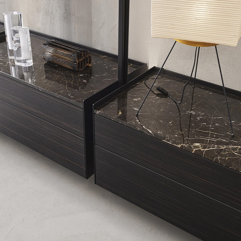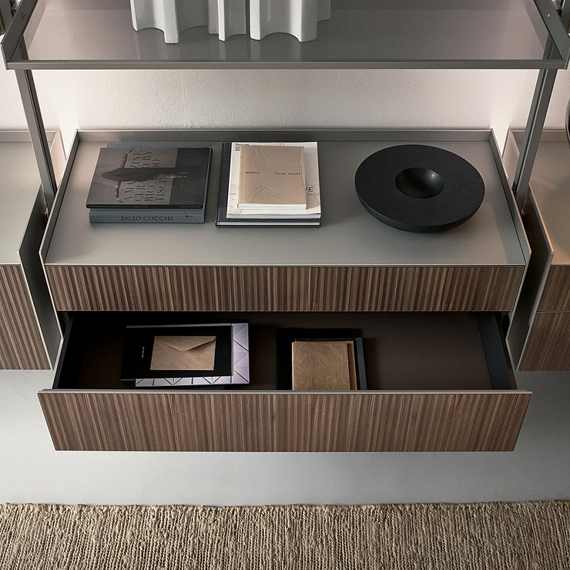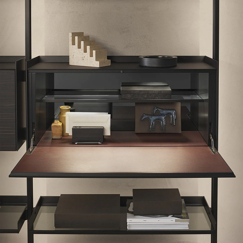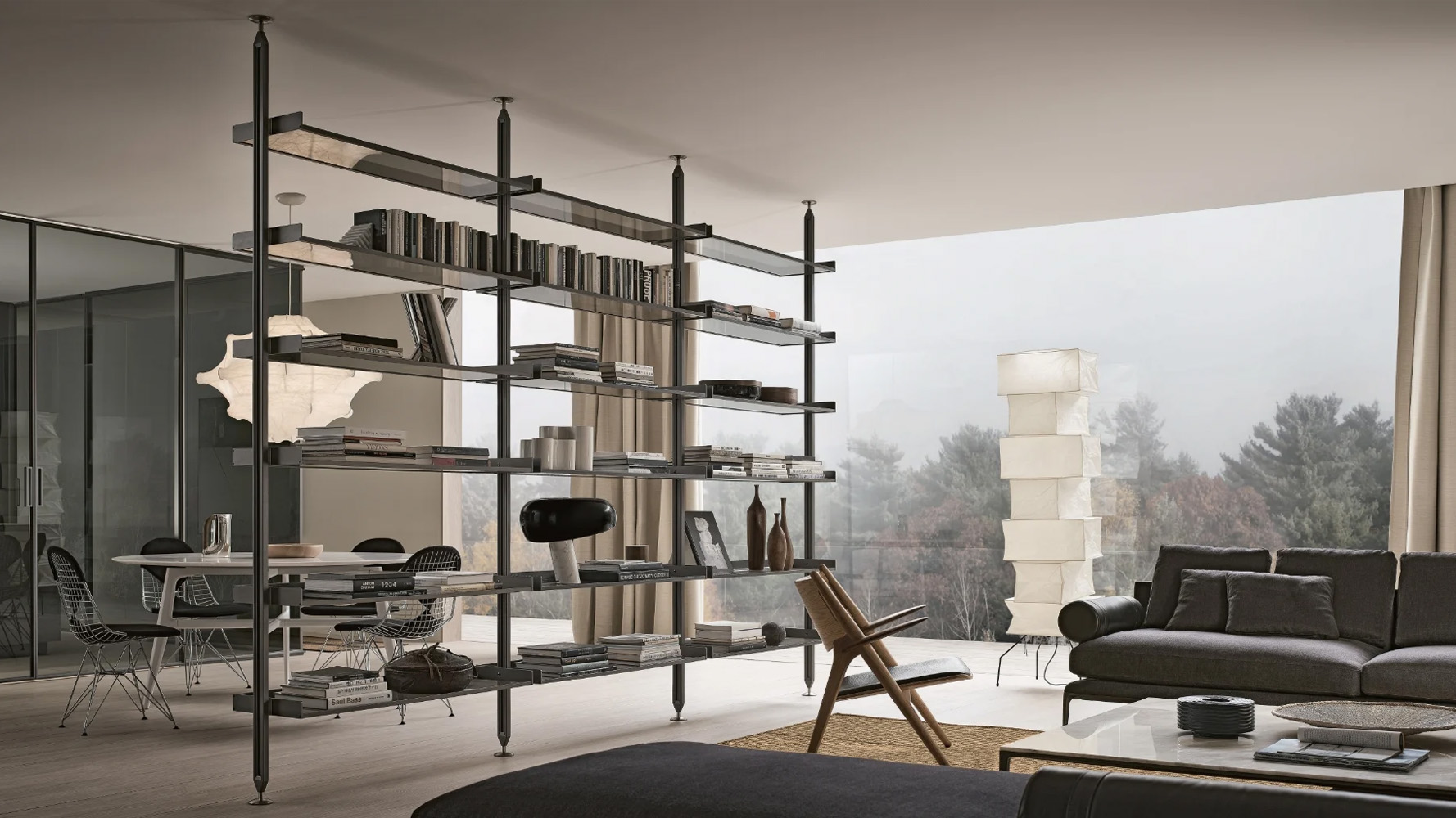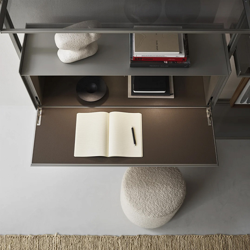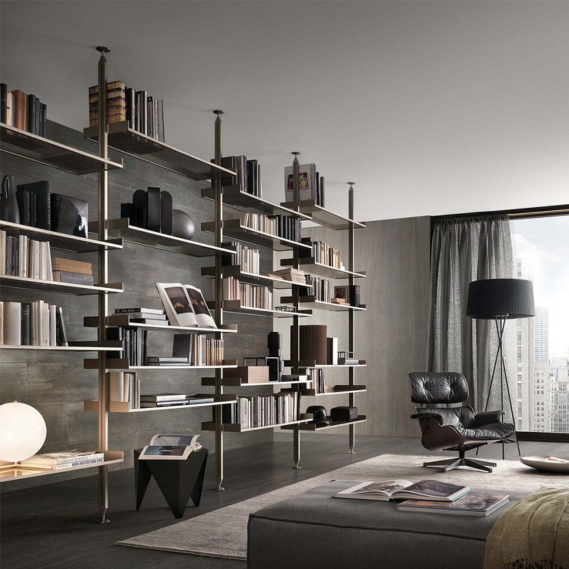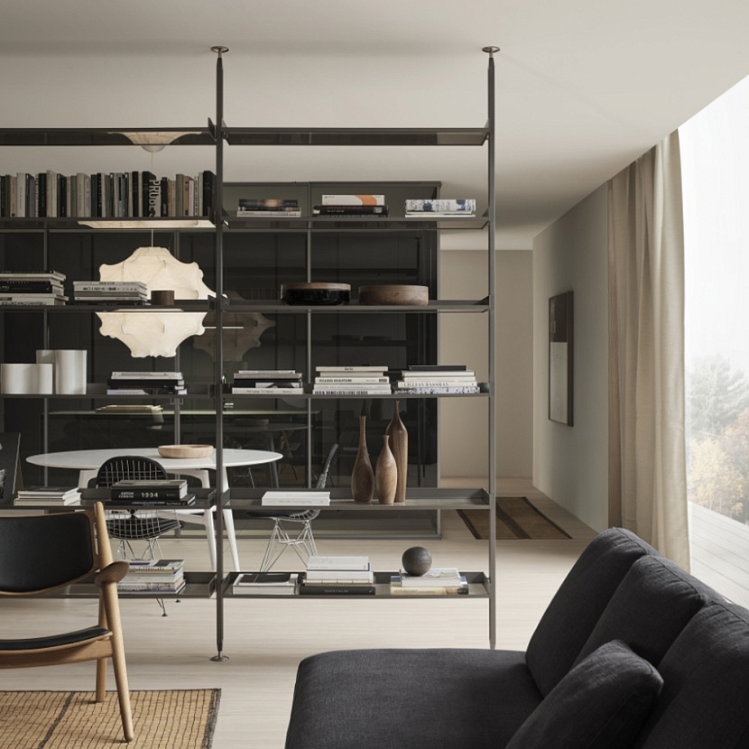 Zenit интегрируется в интерьеры гостиной зоны, где требуется архитектурная система хранения с высокой композиционной гибкостью и минималистичной конструкцией.