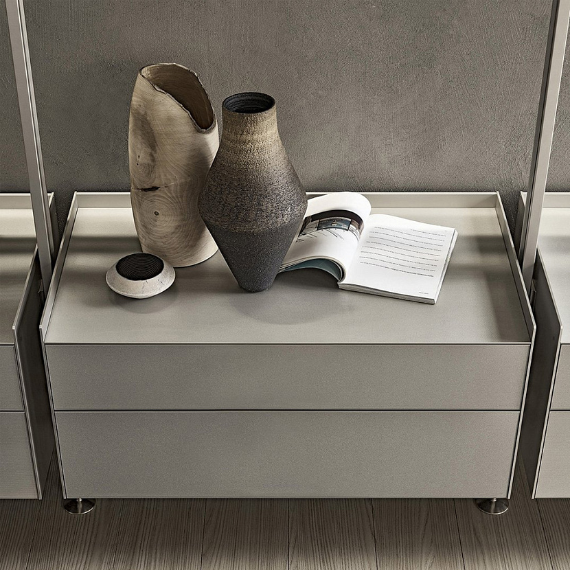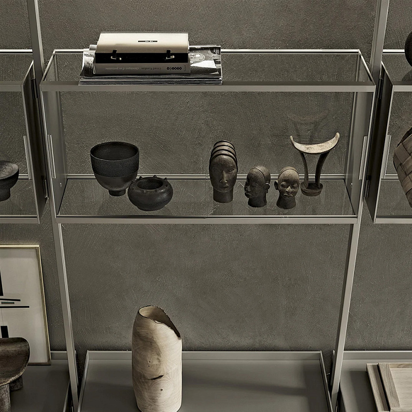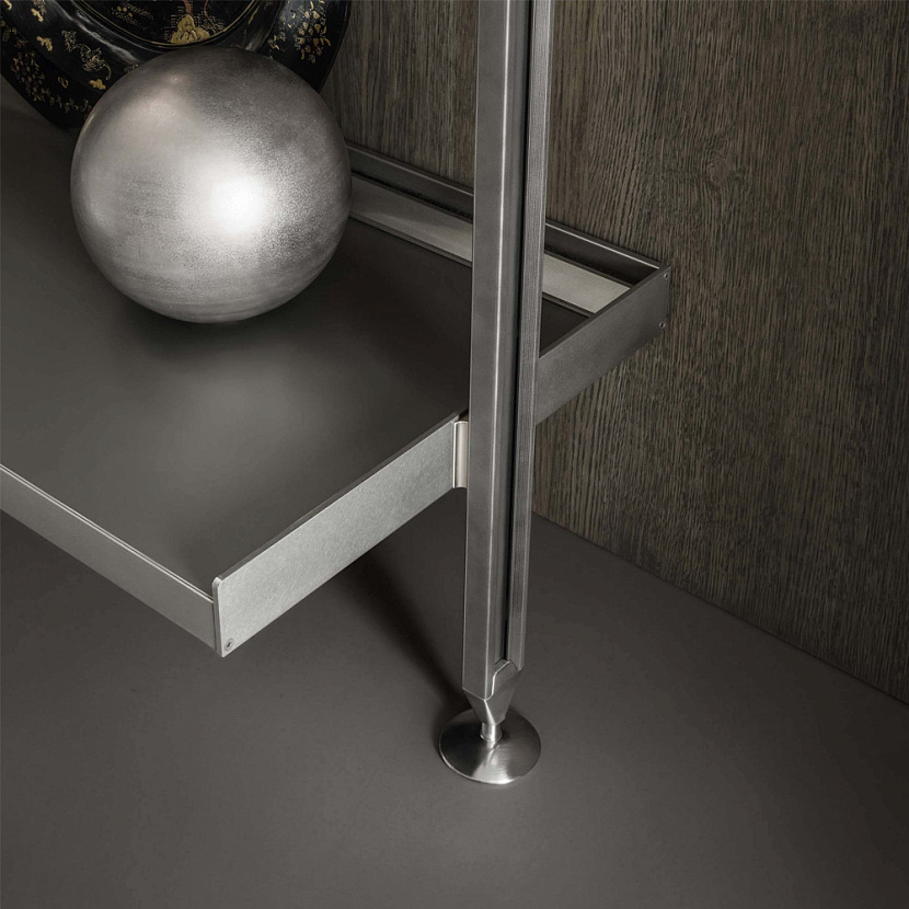 Система построена на вертикальных алюминиевых стойках, устанавливаемых от пола до потолка и формирующих лёгкую пространственную структуру. Такой принцип позволяет свободно размещать полки, шкафы, витрины и другие элементы системы, определяя их количество и высоту в соответствии с архитектурной композицией интерьера.