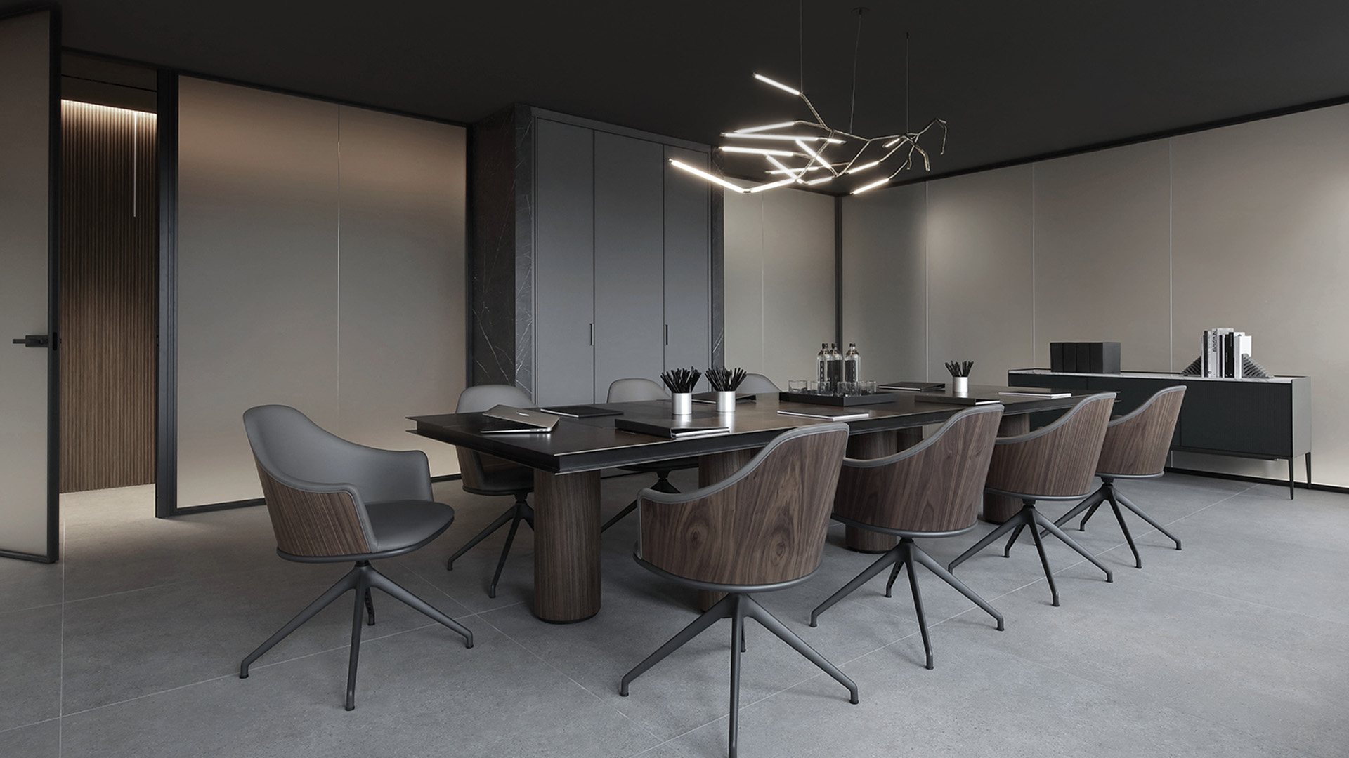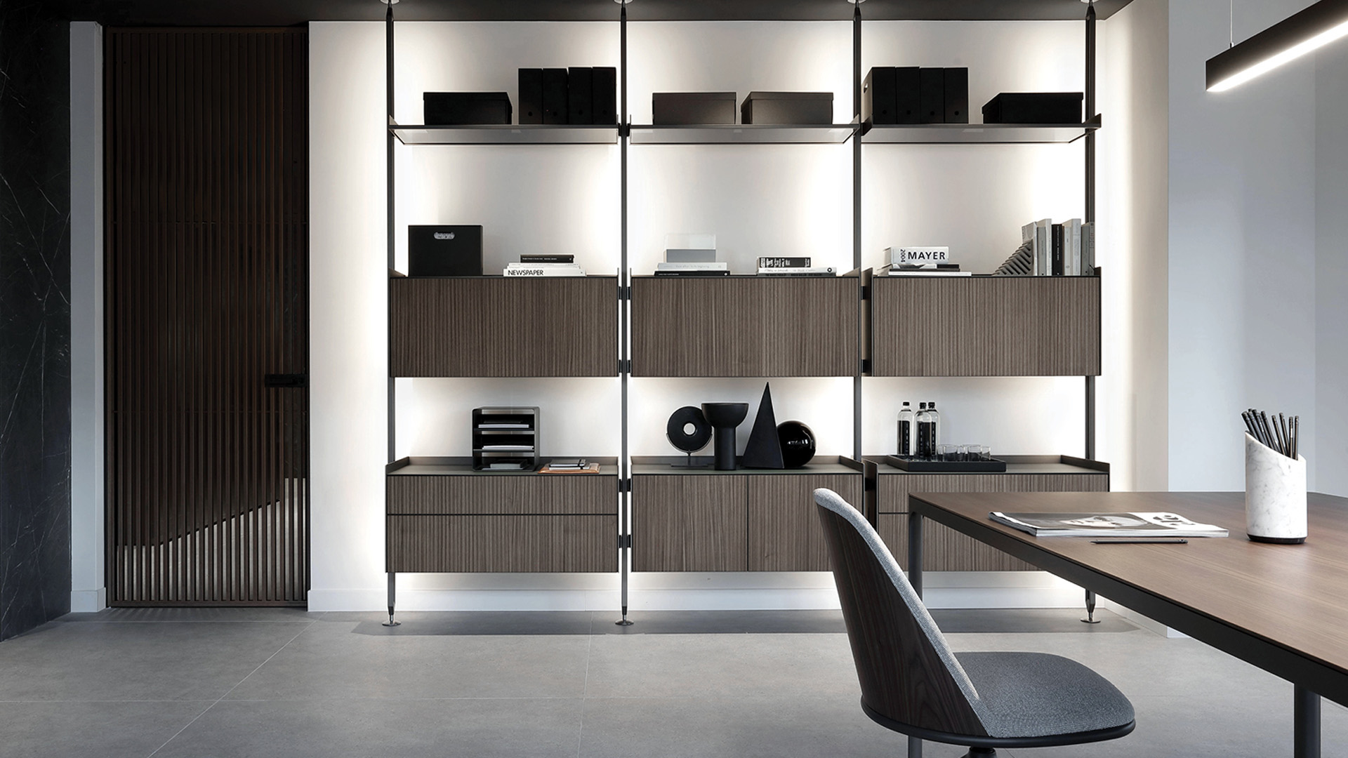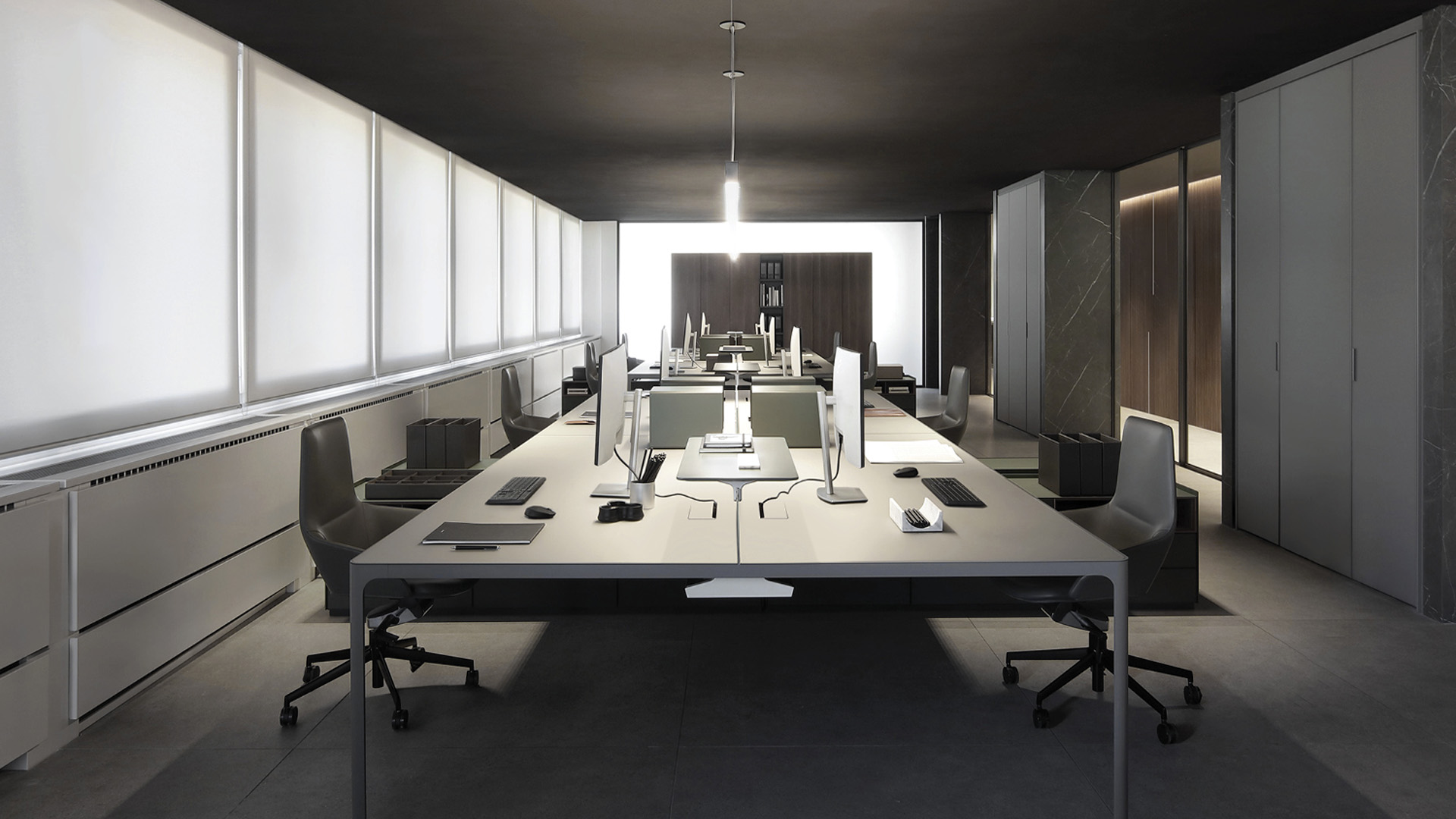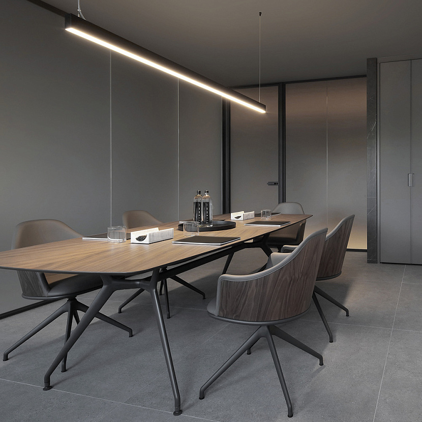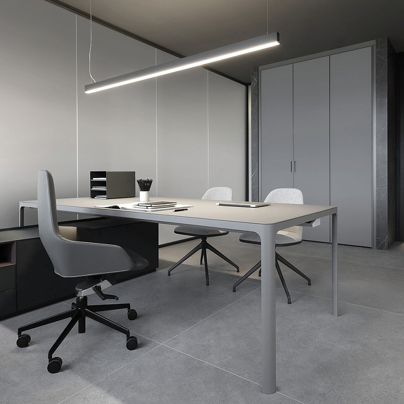 В проекте используются системы хранения Self и Flat System, которые формируют функциональные рабочие зоны и пространства для хранения документов и материалов. Минималистичная геометрия алюминиевых конструкций и стеклянных элементов создаёт строгую и технологичную атмосферу офиса, где мебельные и архитектурные решения объединяются в целостную композицию современного рабочего пространства.