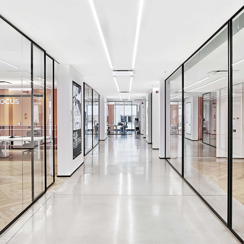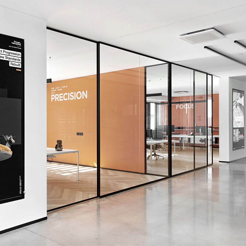 Раздвижные стеклянные панели Velaria с тонкими алюминиевыми профилями дополняют систему организации пространства, обеспечивая лёгкую трансформацию помещений и визуальную связь между различными функциональными зонами. Интерьер дополняют модульная библиотечная система Zenit, столы Flat System, а также дверные решения Vela, формируя цельную и технологичную рабочую среду, характерную для современной офисной архитектуры.