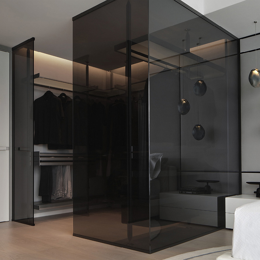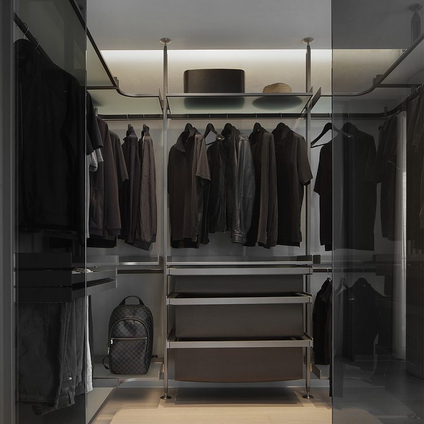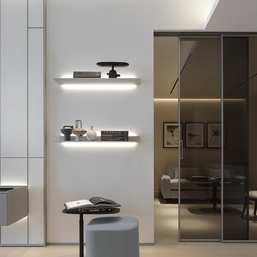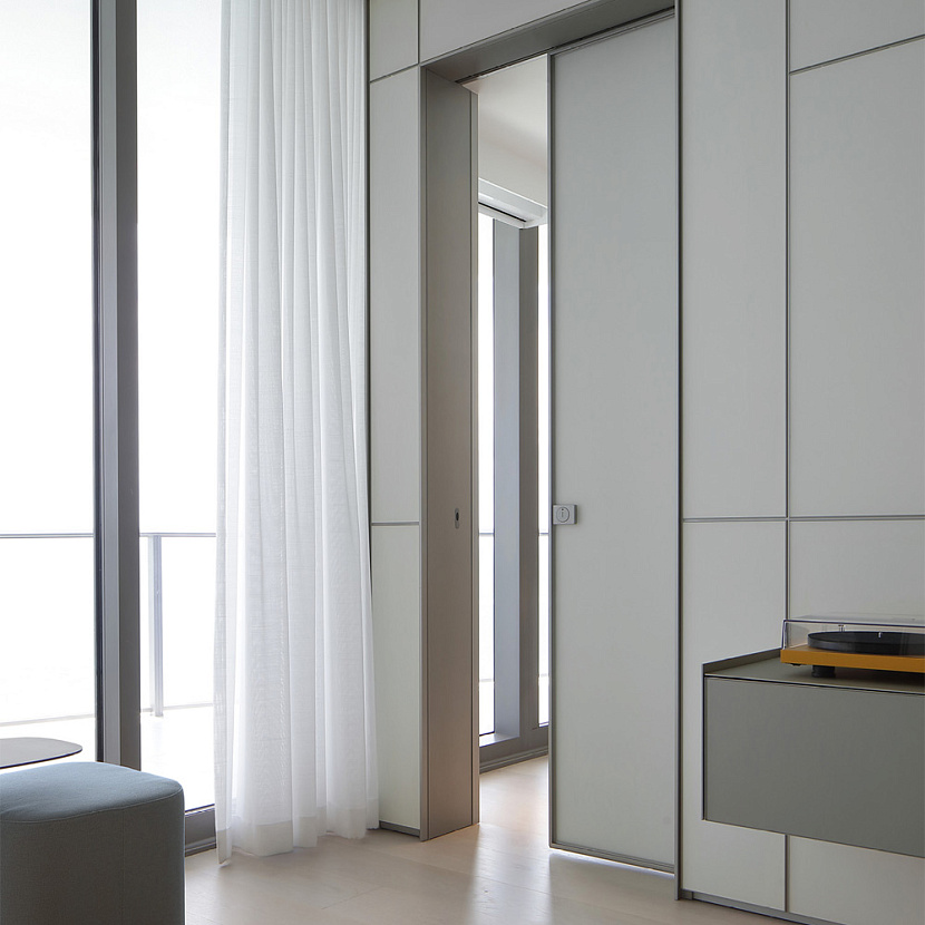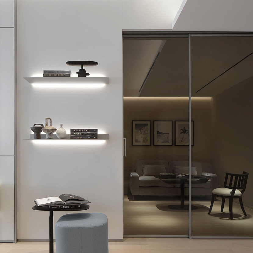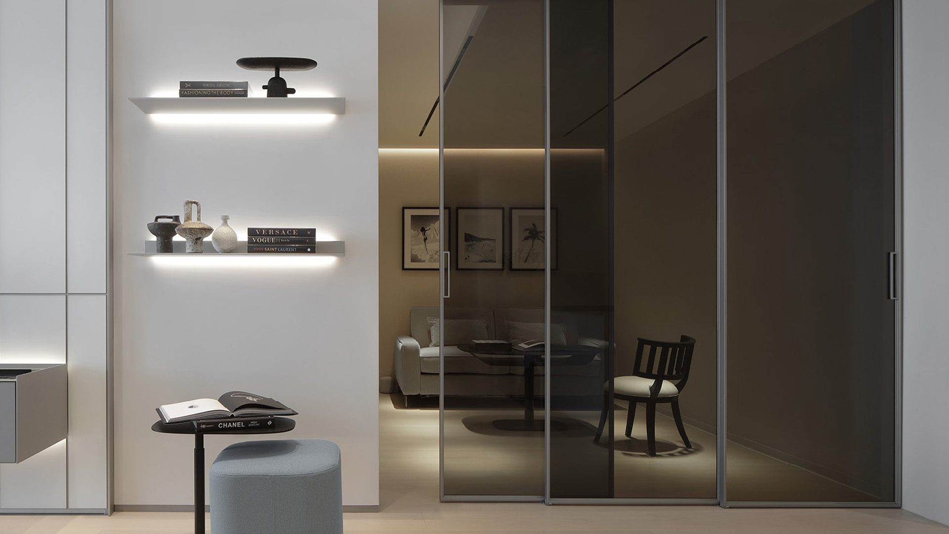 В интерьере используются решения Rimadesio, формирующие целостную архитектуру пространства. Modulor — система стеновых панелей — задаёт архитектурную структуру интерьера и позволяет интегрировать элементы хранения и экспозиции в поверхность стен. Модульная библиотечная система Zenit и система хранения Self организуют функциональные зоны и создают лёгкие композиции хранения. Раздвижные стеклянные панели Velaria и распашные двери Moon обеспечивают гибкое зонирование пространства, сохраняя визуальную прозрачность и чистоту архитектурных линий.