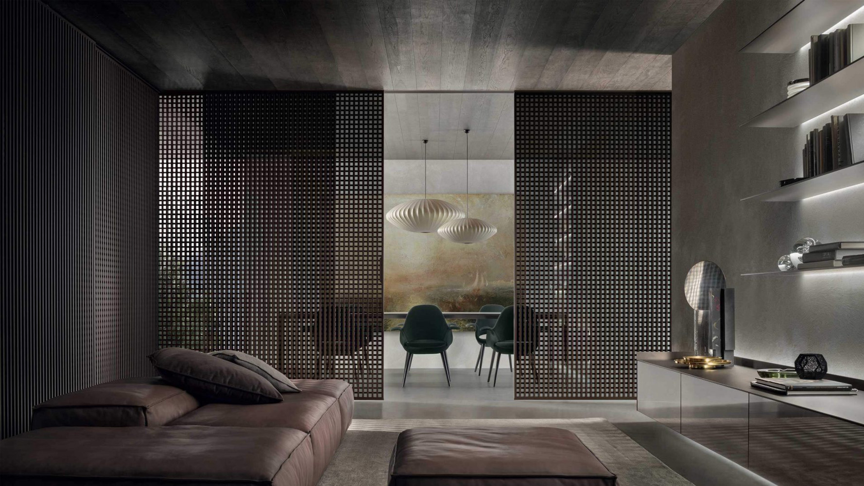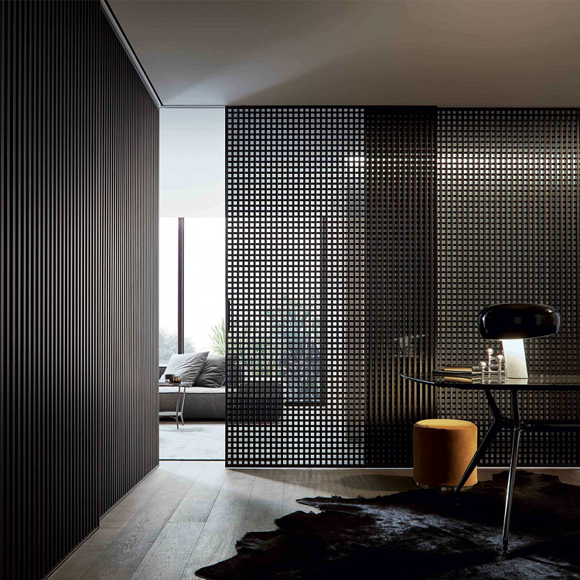 Различные варианты отделок стекла и алюминиевых профилей позволяют использовать Daimon как инструмент деликатного зонирования и архитектурного акцентирования пространства.