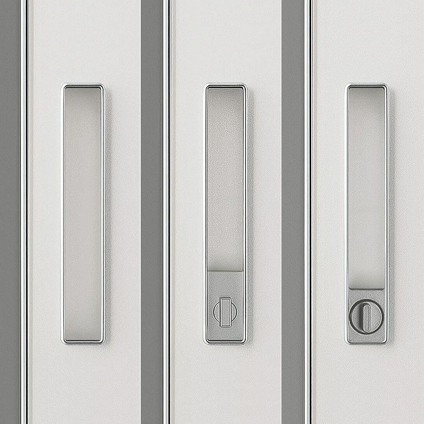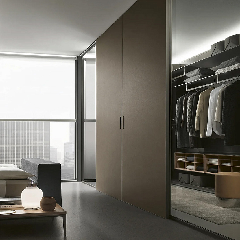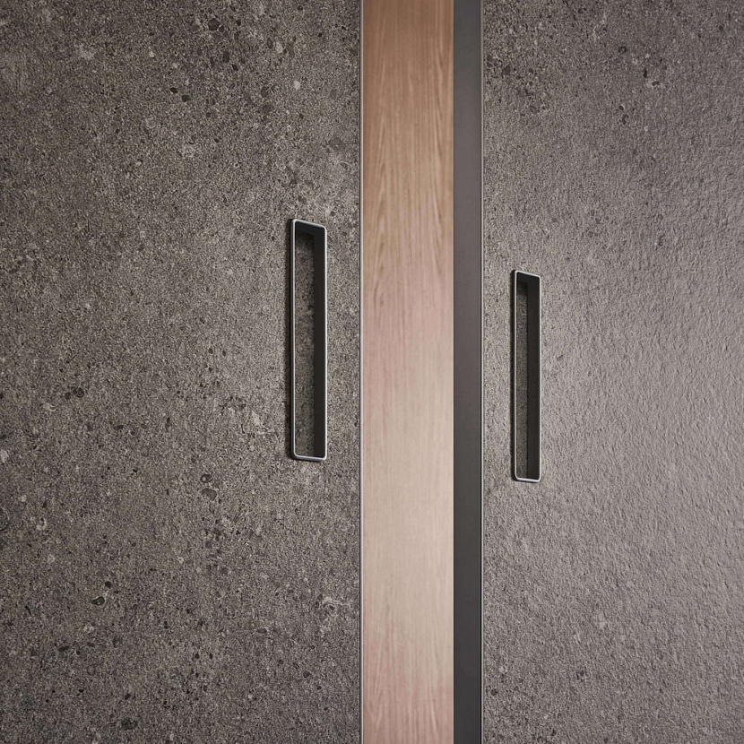 Панели изготавливаются по индивидуальным размерам и оснащаются утопленной металлической ручкой с вставкой в отделке панели, что сохраняет чистоту плоскости и усиливает архитектурную строгость системы.