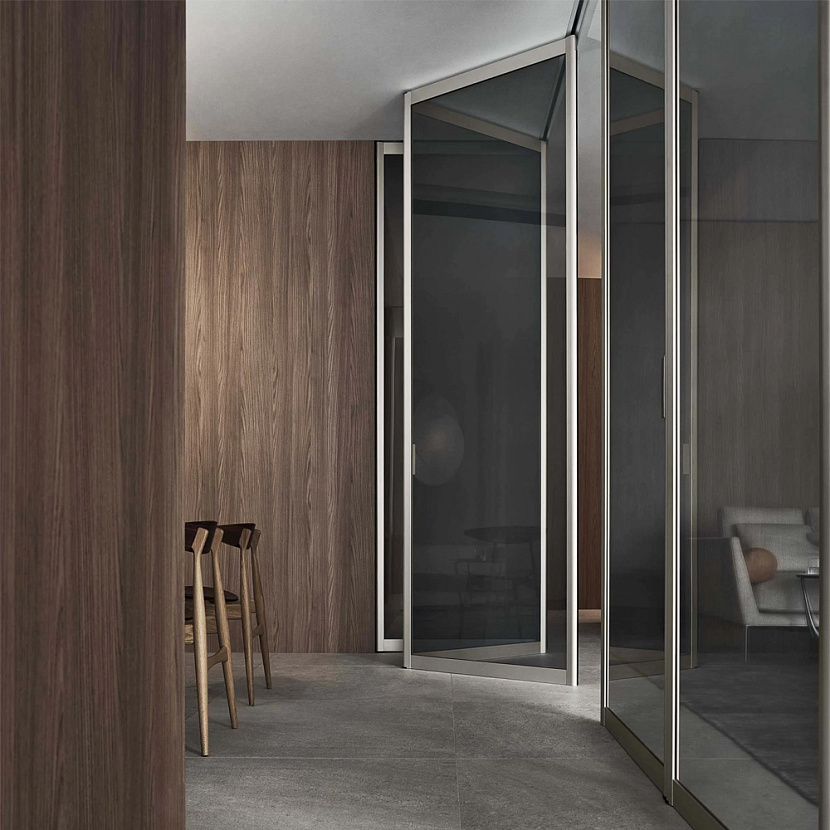 Siparium отличается высокой композиционной гибкостью: панели могут использоваться как раздвижные, распашные или складные, что позволяет адаптировать систему к различным архитектурным сценариям — от жилых интерьеров до общественных пространств.
