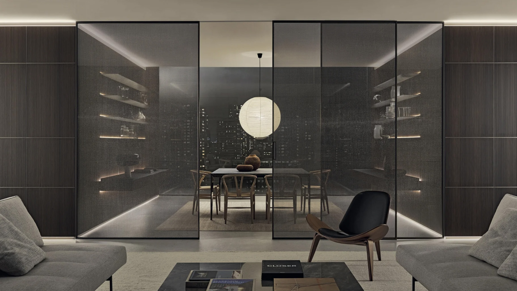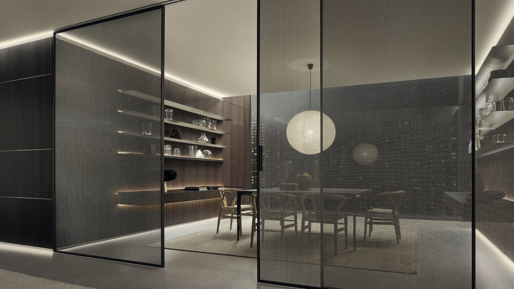 Velaria интегрируется в интерьеры, где требуется точное и минималистичное разделение пространства при сохранении прозрачности и архитектурной целостности.