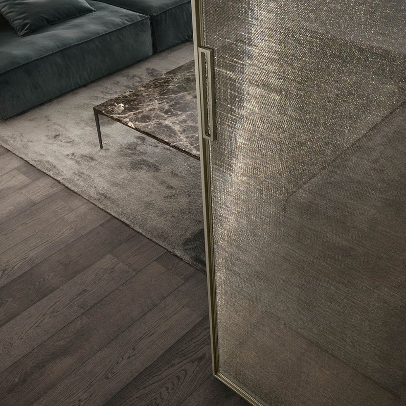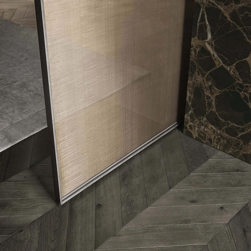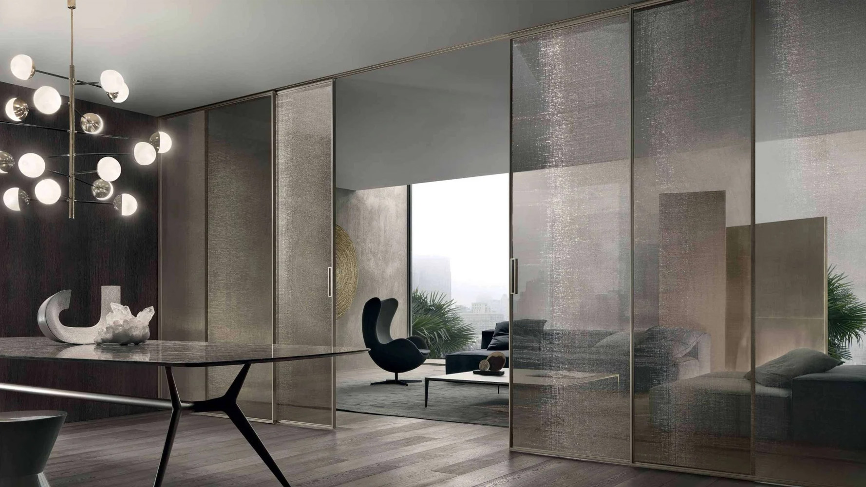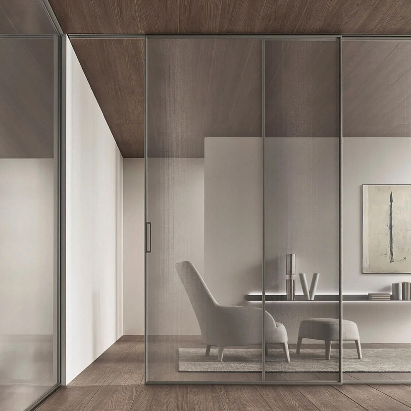 Система раздвижных панелей отличается строгой геометрией и минимальной толщиной алюминиевого профиля, который подчёркивает визуальные качества стеклянной панели и формирует лёгкую архитектурную структуру. Панели изготавливаются по индивидуальным размерам, что позволяет адаптировать систему к различным пространственным сценариям — от жилых интерьеров до общественных пространств.