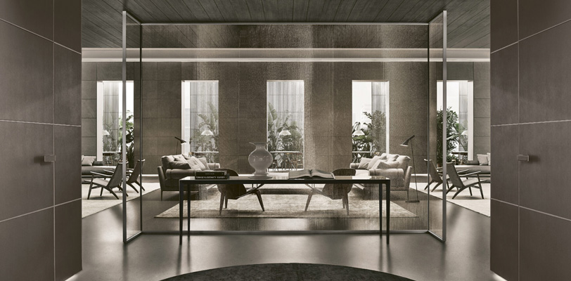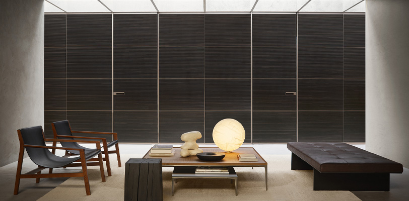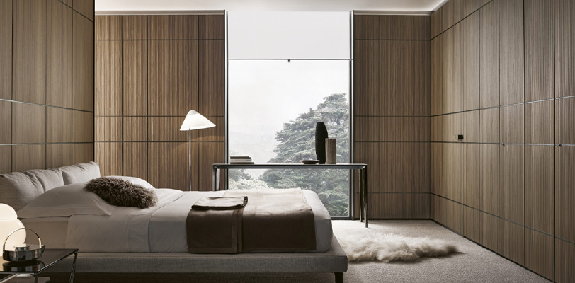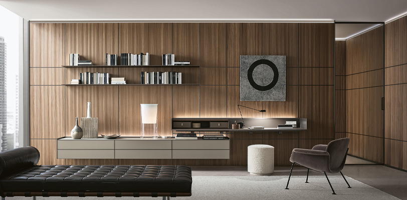 Стеновые панели Rimadesio используются для формирования цельной архитектуры интерьера с интеграцией хранения и функциональных элементов.